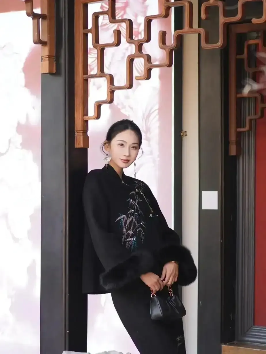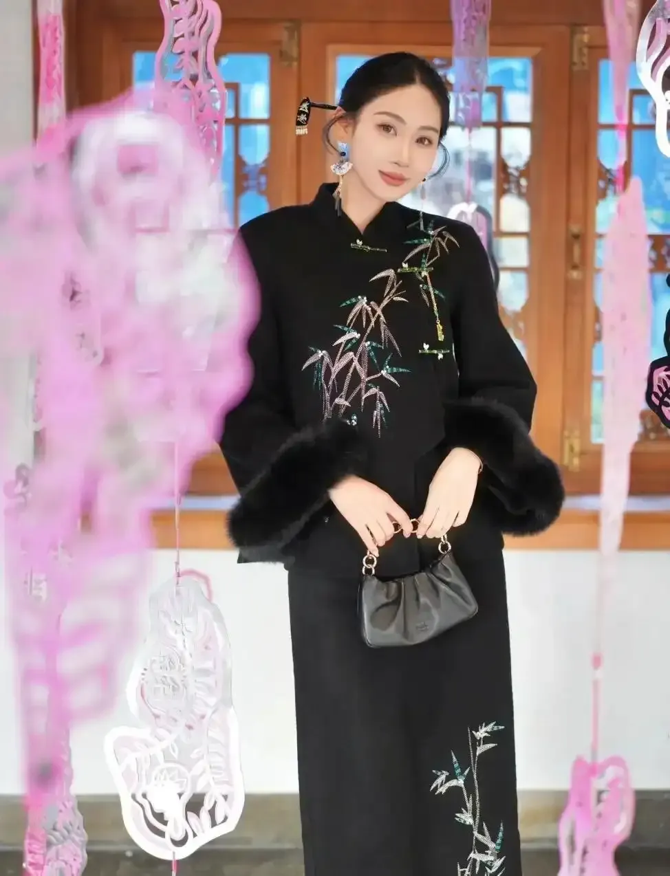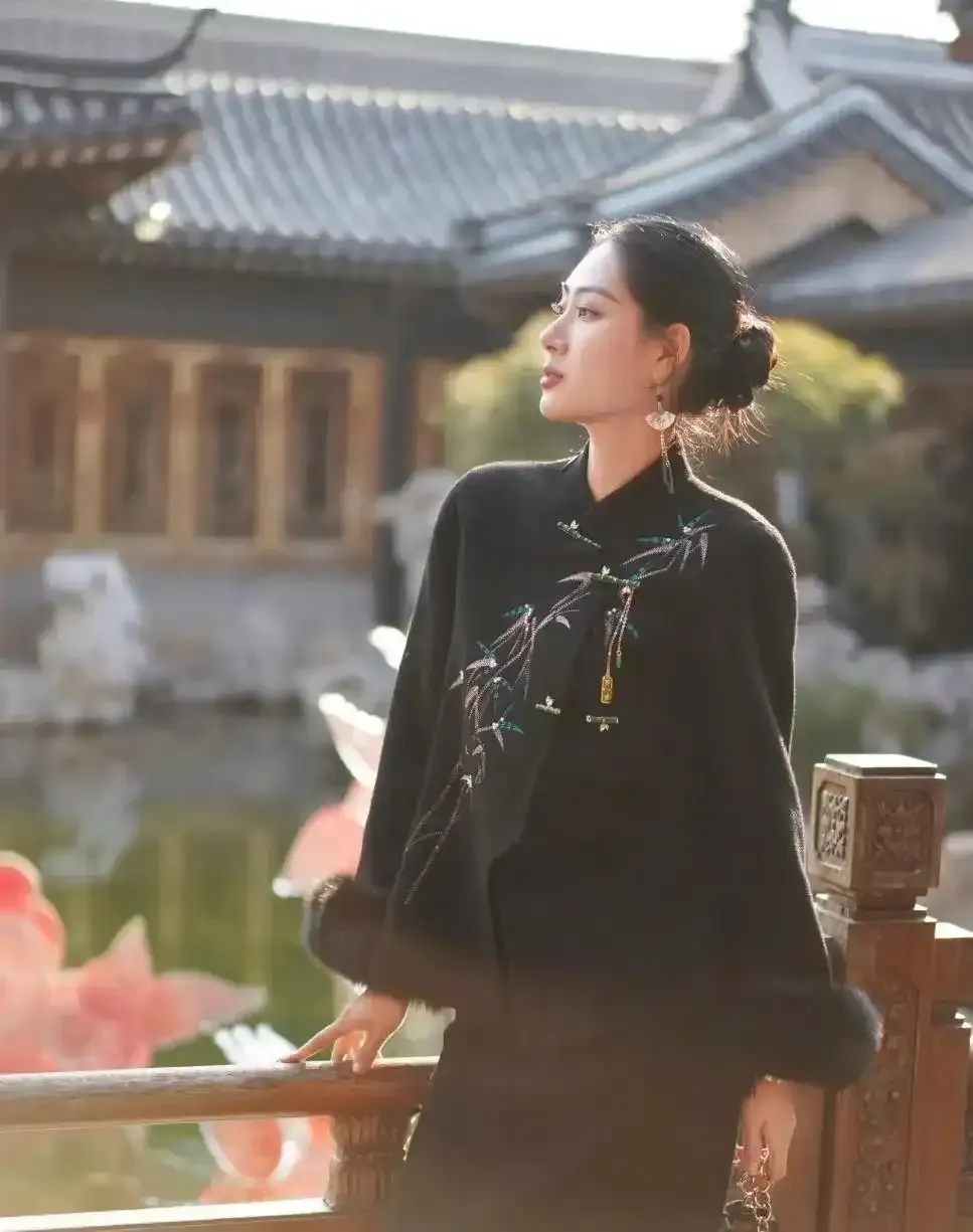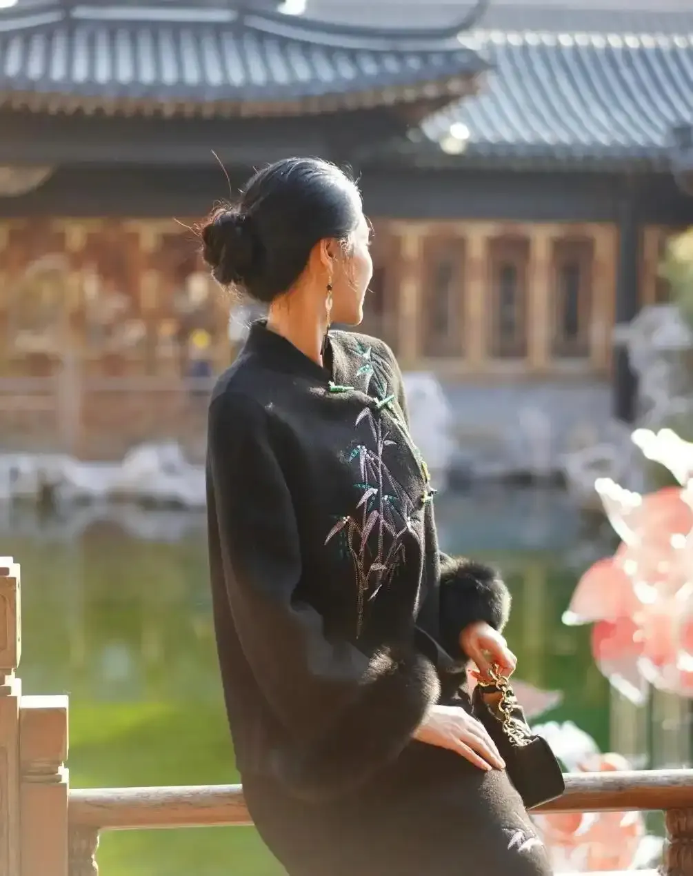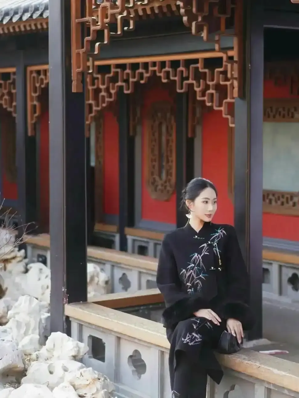 后来发现,黑色新中式真的是最不容易出错的选择。它既有东方美学的韵味,又不会过于突兀。而且黑色本身就很显瘦显高,对身材的包容性也很强。