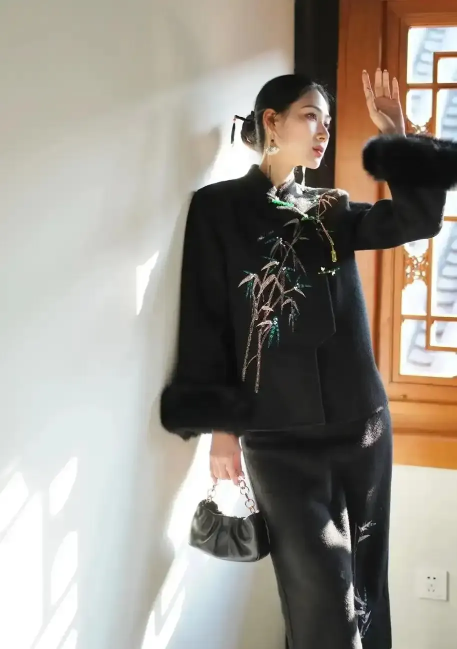 公式一:黑色新中式外套+黑色长裤这是最安全也最出效果的搭配。整体统一的黑色调,配上新中式的盘扣、立领等细节,既有传统韵味又不失现代感。关键是要注意面料的选择,最好选择有一定挺括度的面料,这样穿出来才有型。