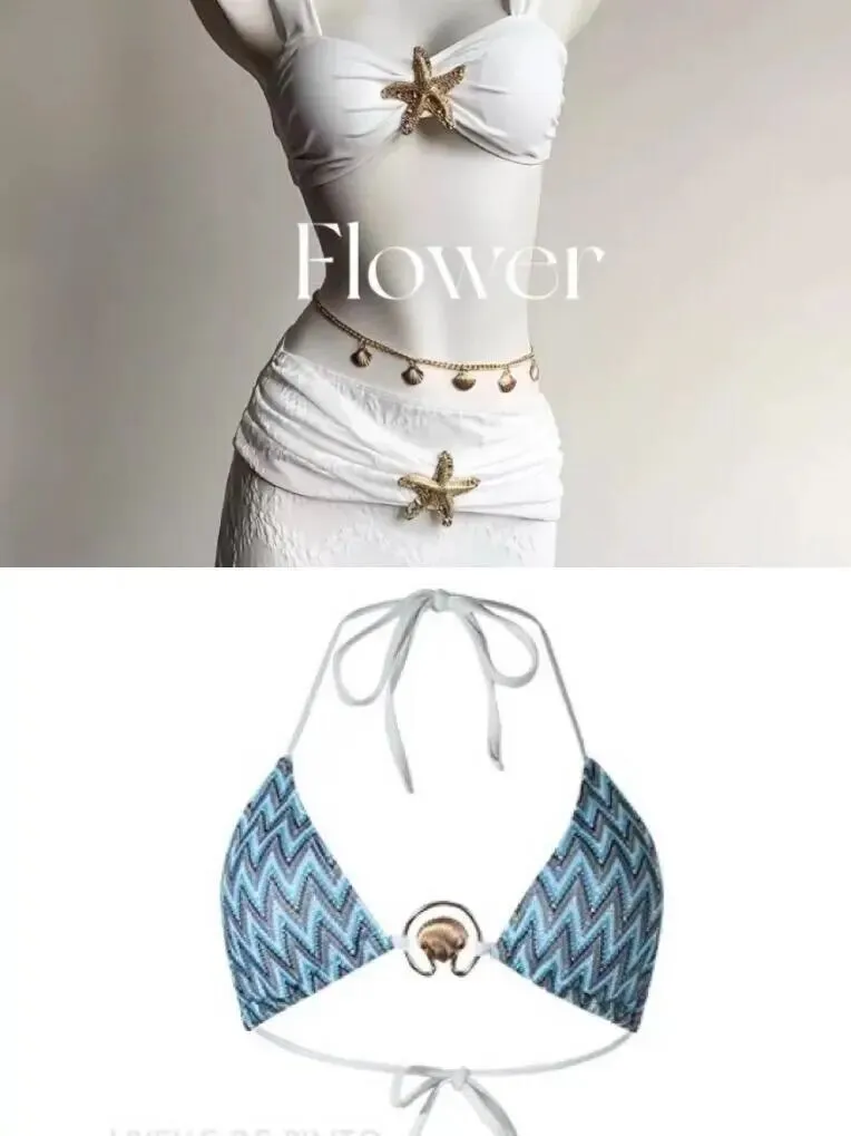 贝壳,海星,金属扣这类元素,不一定都要穿在身上,也可以单独拍一张近景,当作整组里的呼吸位,镜头靠近一点,手拿着或者放在身体旁边,让配件和肤色,泳衣颜色一起入镜,