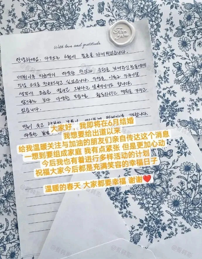 据韩媒,演员文彩元宣布将在6月和素人男友结婚,并上传手写信。
