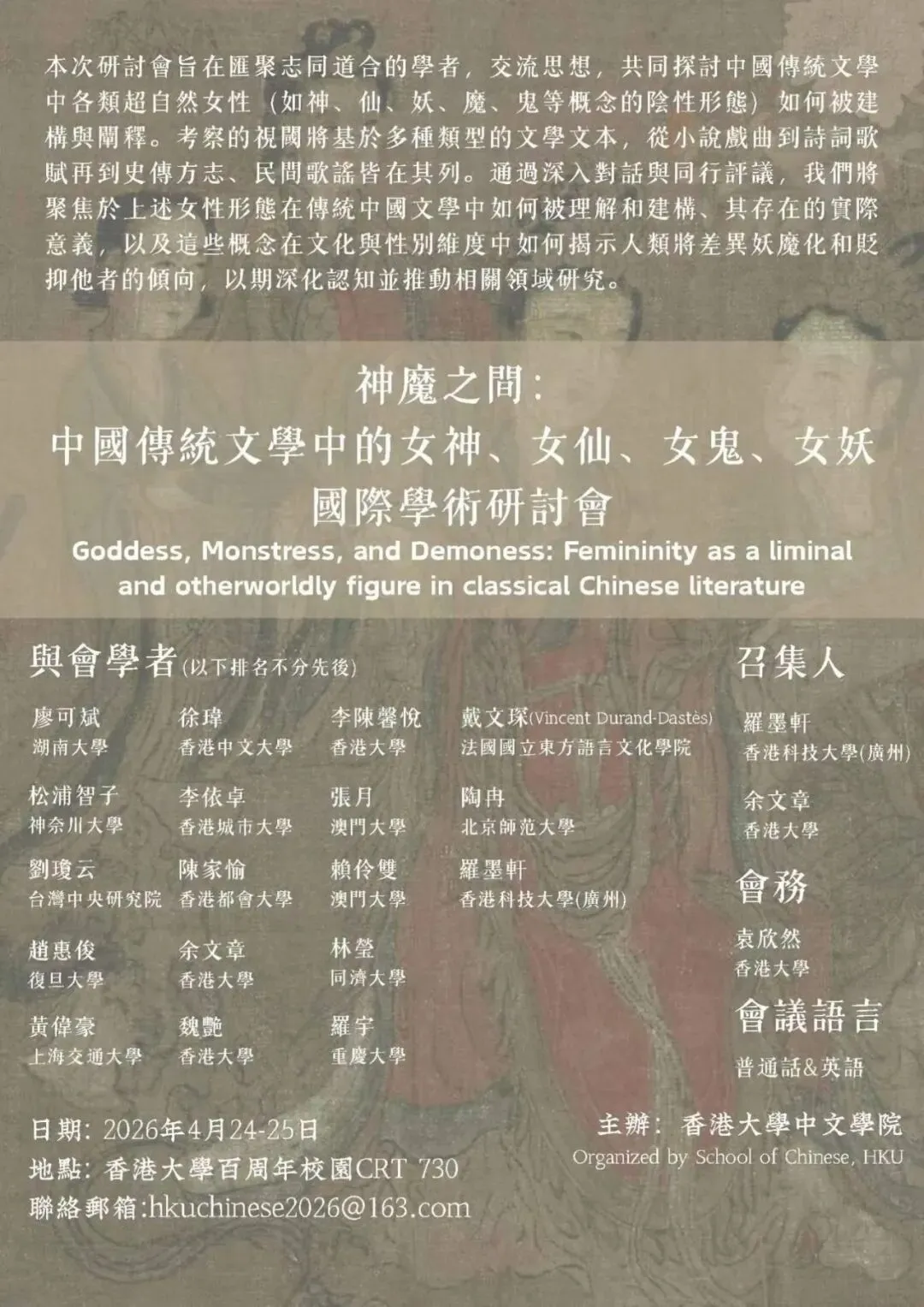 当前位置:首页>美女资讯>【會議預告】神魔之間:中國傳統文學中的女神、女仙、女鬼、女妖國際學術研討會