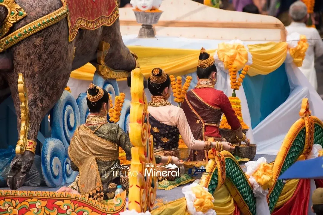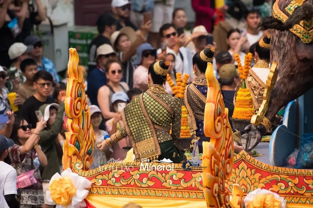 - 僧侣方阵:6座僧座花车上,约300位僧侣与小沙弥庄严而坐,信众用混合花香的净水为佛像与僧人洒水祈福,镜头捕捉到水滴飞溅时晶莹的光斑。