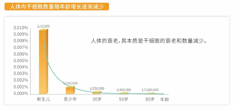 干细胞不仅是人体进化和发育的基本单位,也是组织、器官生长的基本单位,同时更是创伤、疾病损伤和衰老退行性病变时机体再生和修复的基本单位。随着年龄增长,人体内干细胞质量和数量也在逐渐下降,无法先生出足够的健康细胞替换组织中衰老病变细胞,最终表现为人的衰老和疾病。所以,恢复体内活跃干细胞的数量是逆转衰老、预防和调控各种疾病的关键。