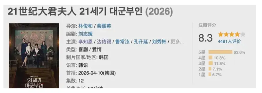 还有些韩剧,一开场就把野心写在演员表里——比如IU和边佑锡主演的新剧《21世纪大君夫人》。