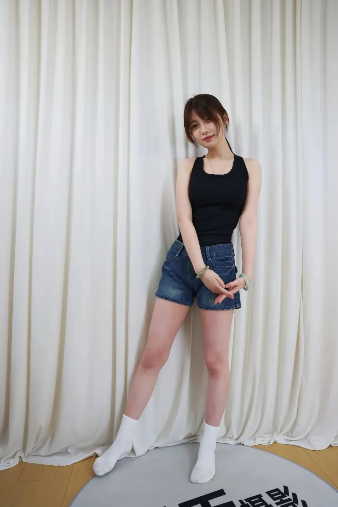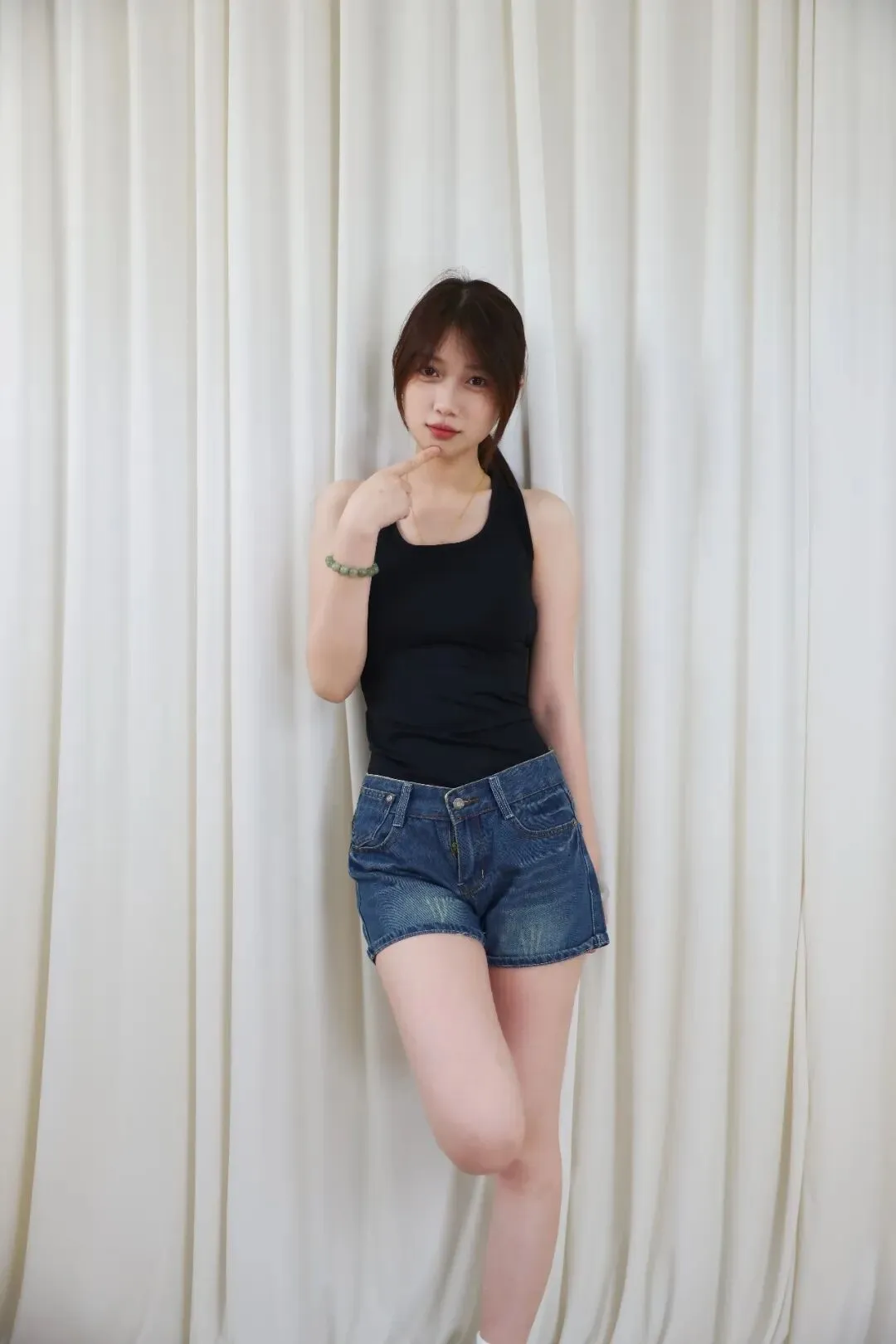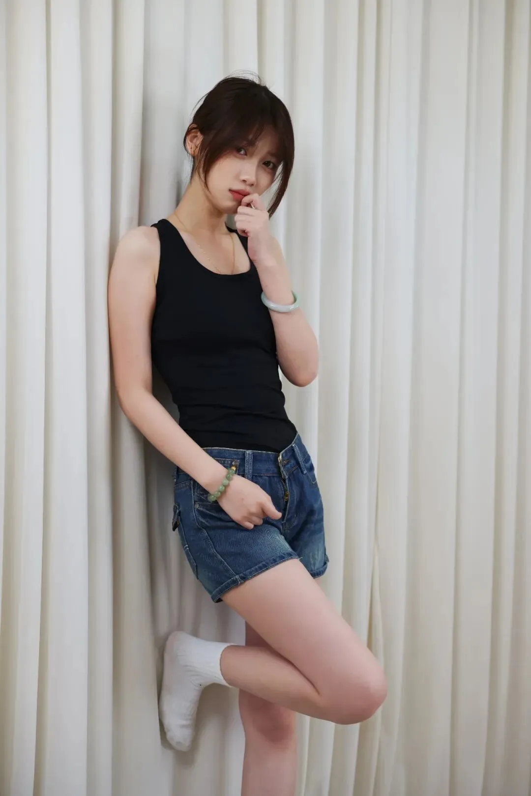 没有繁杂的装饰,没有刻意的摆拍,米白色的垂坠幕布做背景,把所有焦点都留给人物。宁宁身上的穿搭,是日常又出片的少女感模板:黑背心勾勒出舒展的线条,牛仔短裤的随性慵懒,搭配白棉袜的清爽元气,每一处细节都在传递「松弛又鲜活」的青春气息。