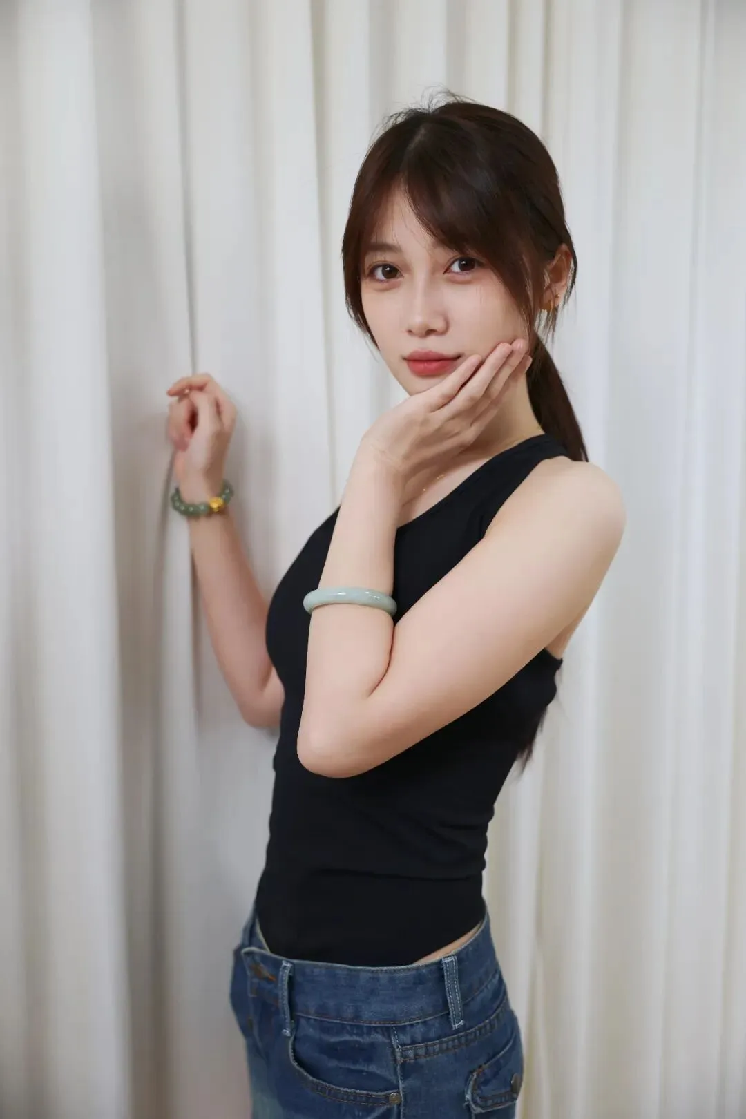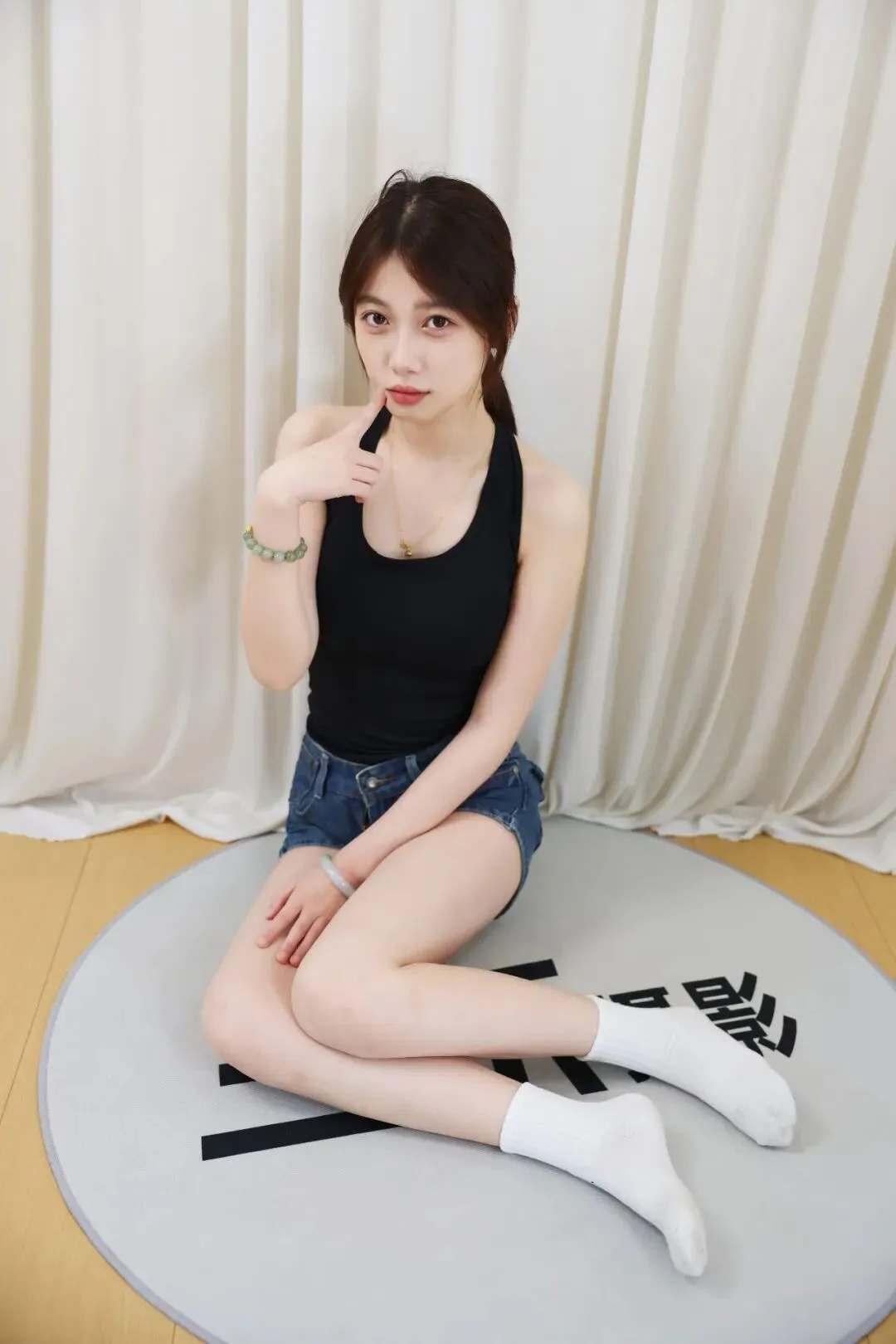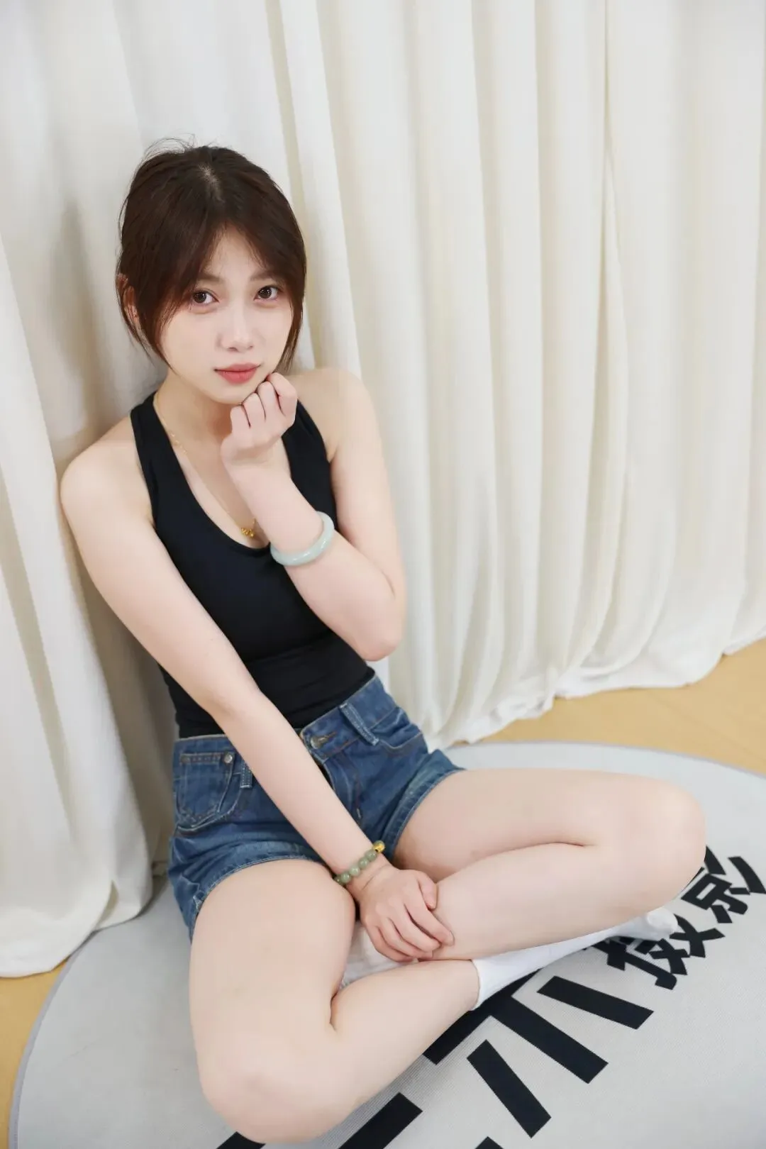 没有繁杂的装饰,没有刻意的摆拍,米白色的垂坠幕布做背景,把所有焦点都留给人物。宁宁身上的穿搭,是日常又出片的少女感模板:黑背心勾勒出舒展的线条,牛仔短裤的随性慵懒,搭配白棉袜的清爽元气,每一处细节都在传递「松弛又鲜活」的青春气息。