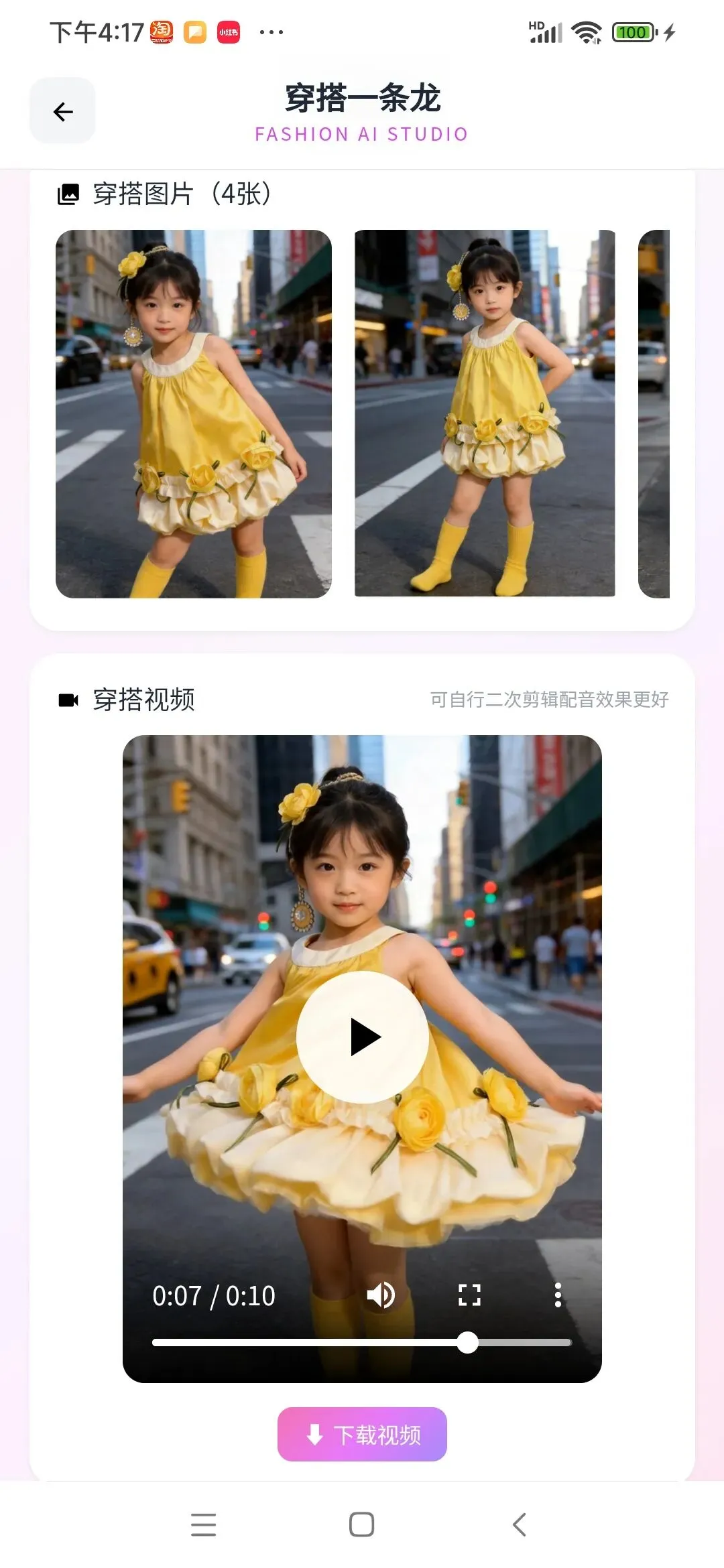 接下来就是见证奇迹的时刻,直接生成4张模特小女孩身穿裙子的高清图片以及一个小女孩转圈展示裙子的10秒视频,种草效果简直拉满!