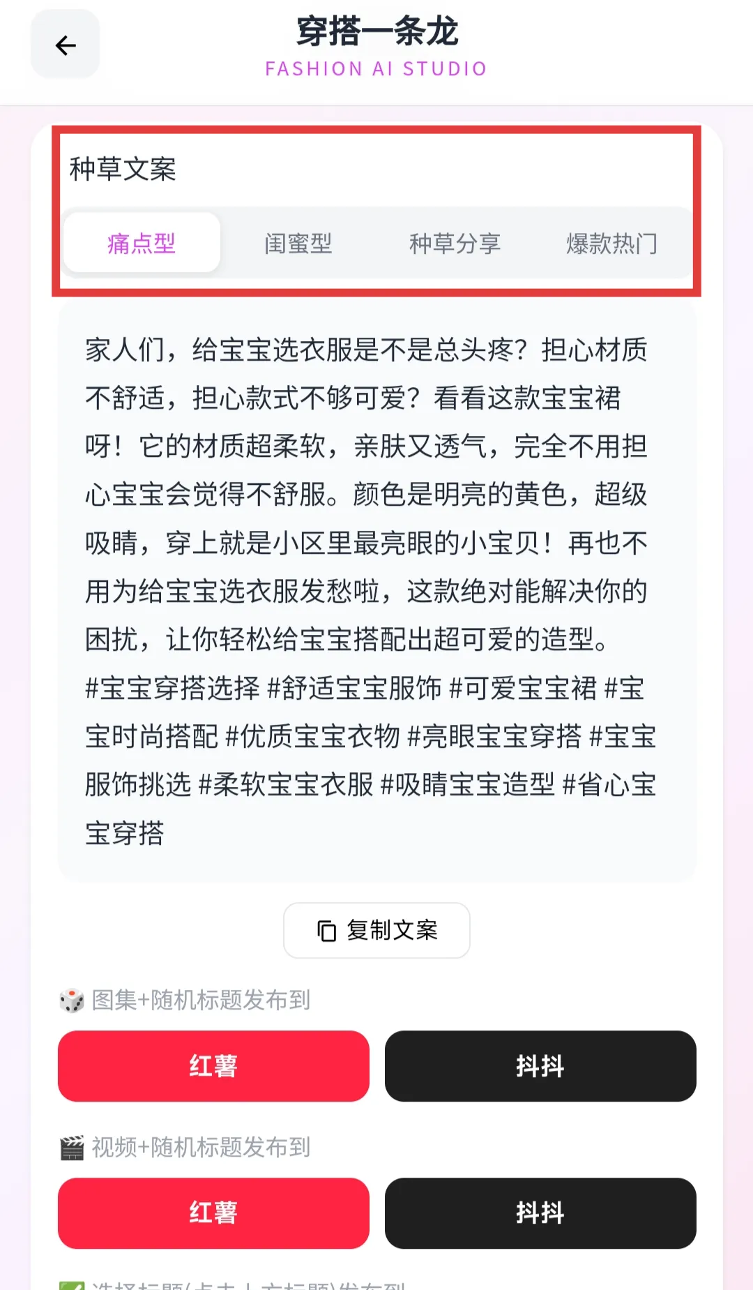 它还直接生成了30个符合小红书平台调性的爆款标题和4种不同风格的种草文案,选定之后可以直接跳转到小红书发布。