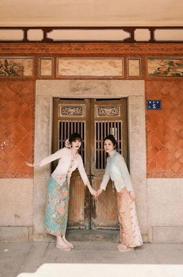 最后图是两个人牵手站在古厝门口。笑颜甜甜蜜蜜,恰当得体。看着她们,就像回到了以前的南洋。