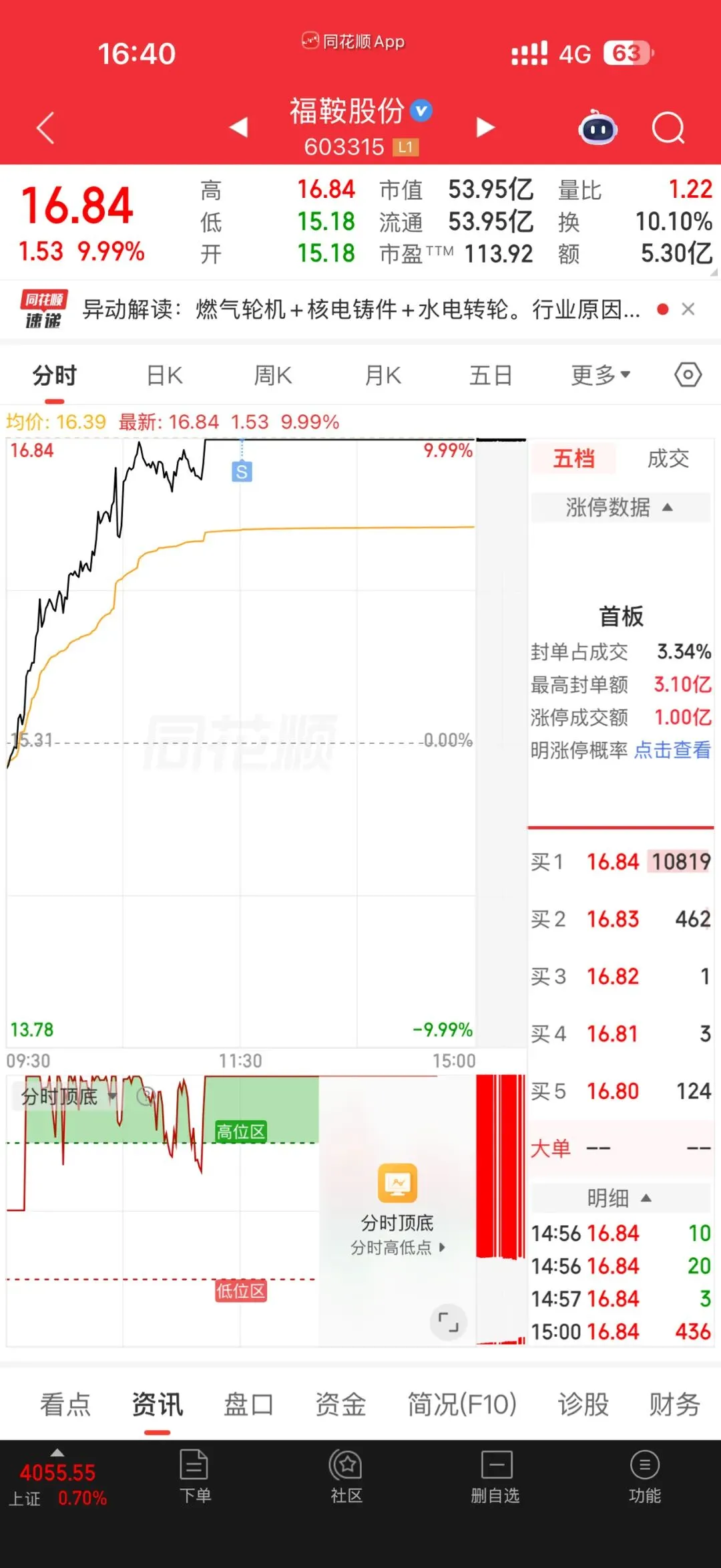早盘,福鞍直接高开高走,一路强势拉升,最终牢牢封死涨停板,在涨停板选择了全部止盈卖出(图中S点),很多朋友会问:明明封板了,为什么要卖?