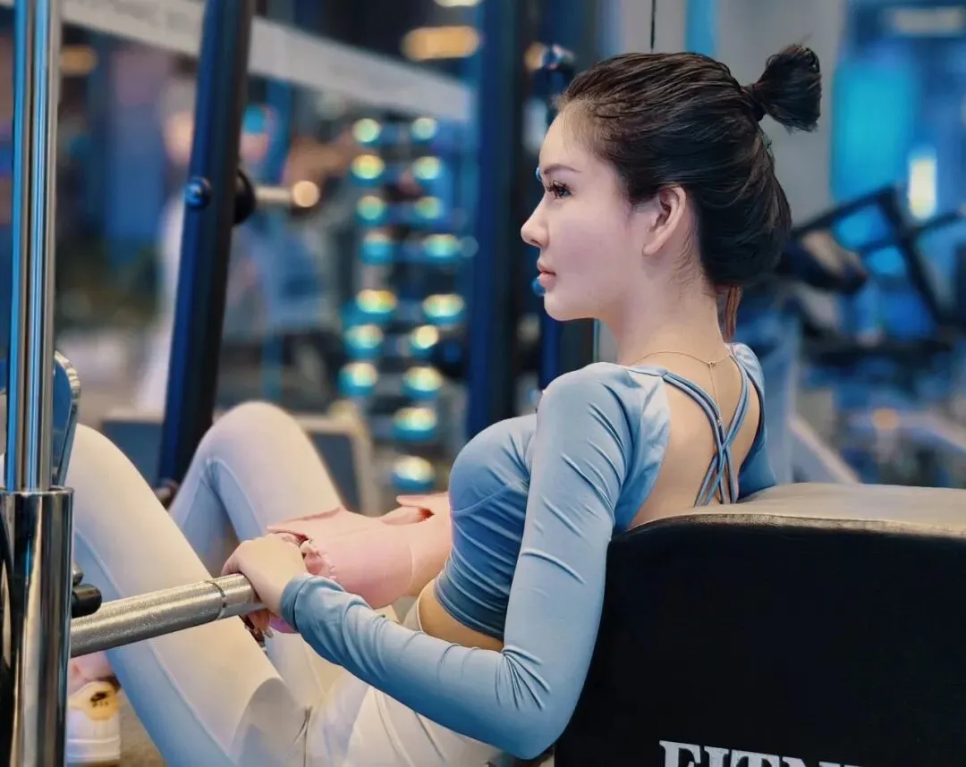 她做的是臀推,用臀部力量把杠铃顶起来。每做一次,臀部的弧线就清晰一次。