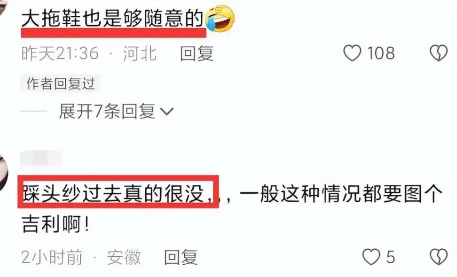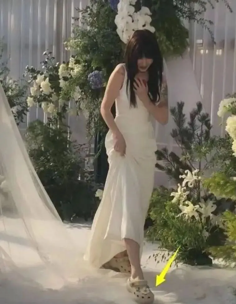 更让人不适的是她的举止,新人交换戒指后,她离场时居然一脚踩在了新娘的头纱上,脚上还穿着洞洞鞋,怎么看都不合时宜,被网友吐槽没分寸。