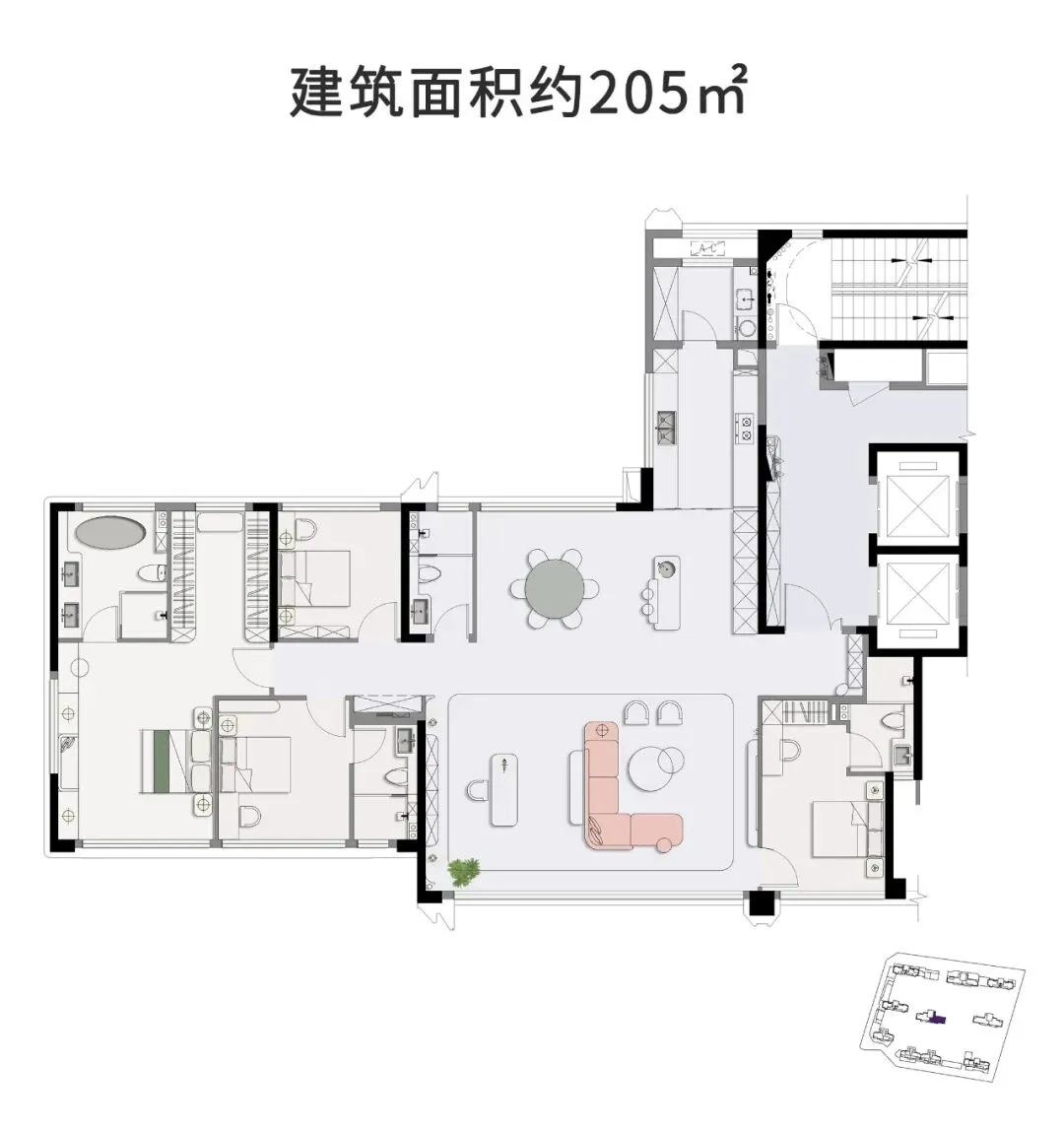 两梯两户,私享约8㎡独立电梯明厅将归家仪式感拉满;约17米南向五开间,无墙柱设计的一体化大厅,搭配超6.5米巨幕宽厅,还设有专属总裁茶室,空间通透开阔,会客休闲一步到位;全明三套卧+三卫,主套卧配备270°转角窗,观景与居住舒适度皆是满分;附赠近33㎡奢阔空间,越级体验堪比传统160㎡大宅。