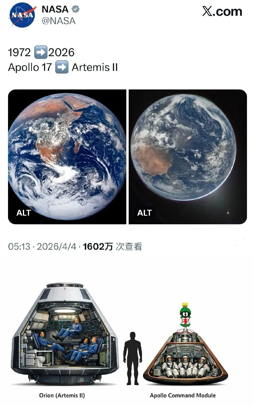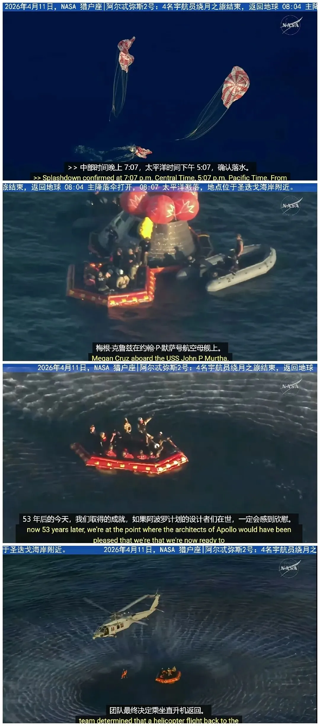 美宇航局NASA于美东时间2026年4月1号April's Day愚人节发射阿尔忒弥斯2号(Artemis II)四人乘组完成深空绕月🌙飞行,并于4月10号成功返回地球🌎
