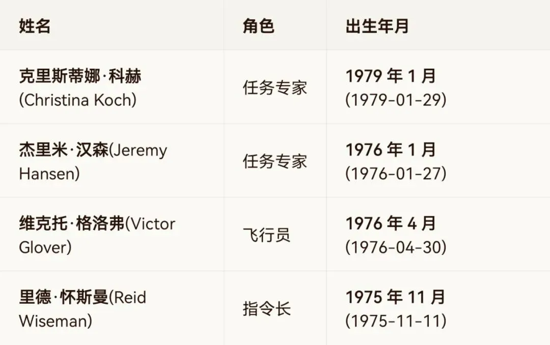 从年龄上看他们均为70后老登,按中国属相而论,有俩男宇航员里德·怀斯曼(Reid Wiseman)和杰里米·汉森(Jeremy Hansen)均属兔🐇,第三个男宇航员