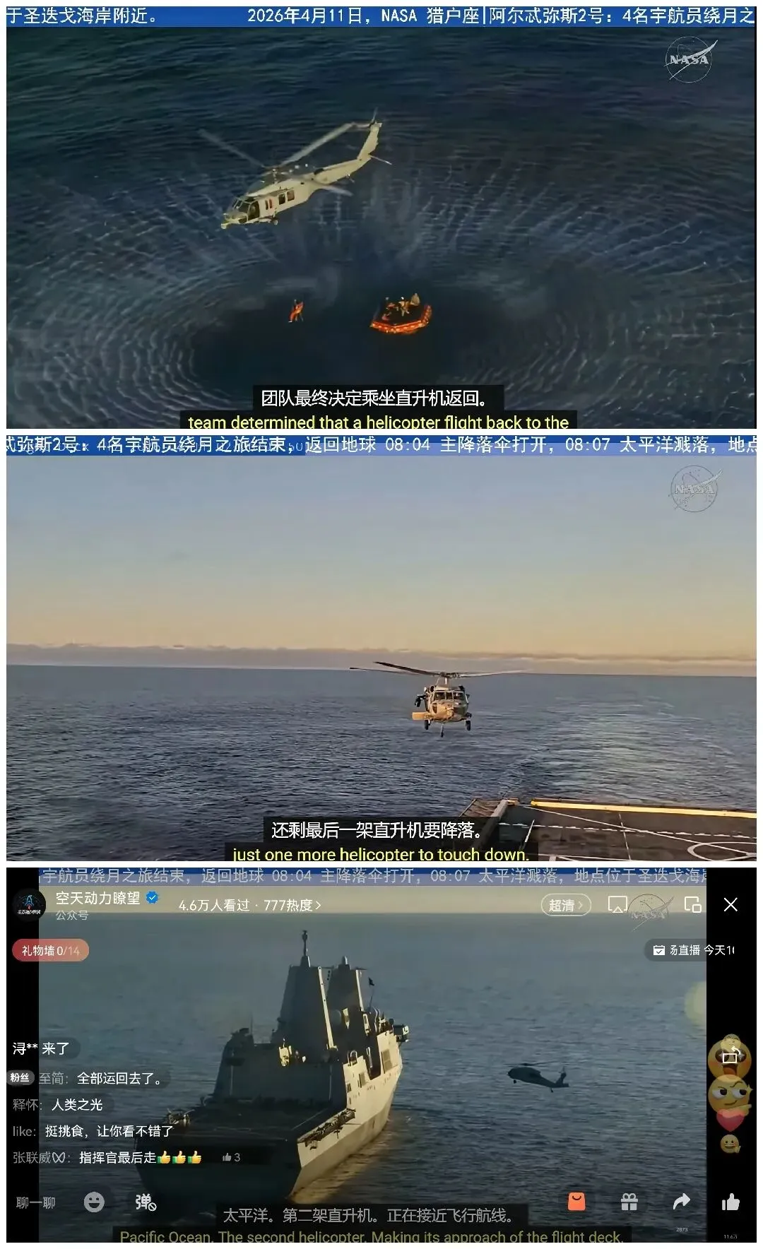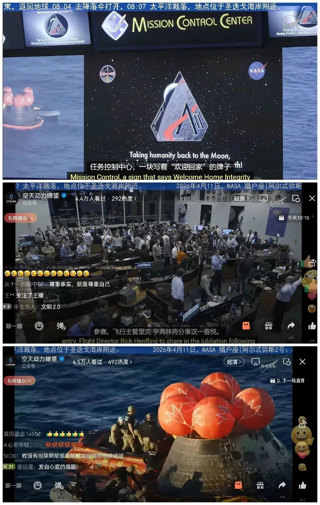 能开直播的公众号主播大部分应该都是航天发烧友,大概率得先申请架设合法且租金不便宜的VPN专线才能让大家观看NASA这次精彩的Artemis II载人绕月飞船返回直播的,在此给“空天动力瞭望”、“SpaceX星舰”等民间航天发烧友公众号点个大大的赞先👍
