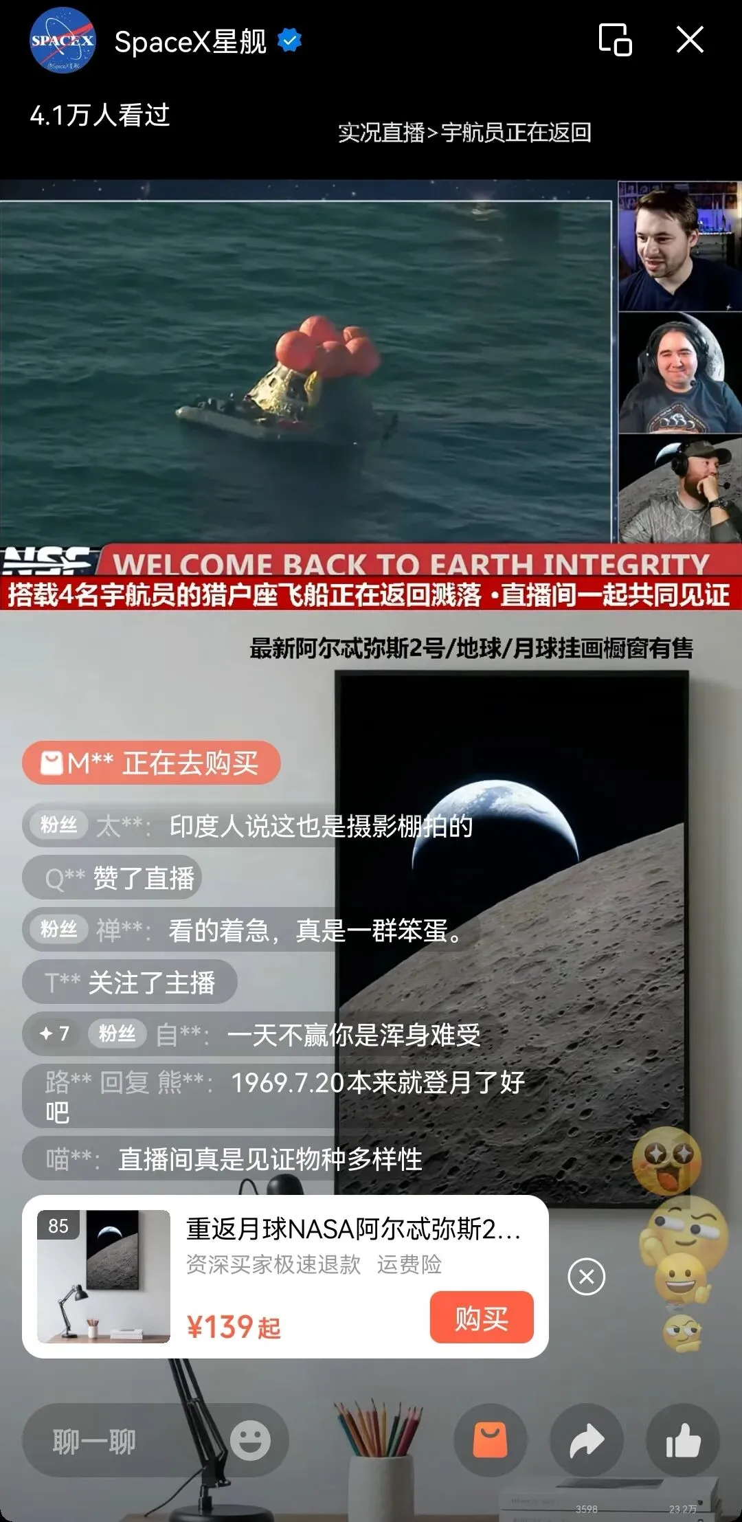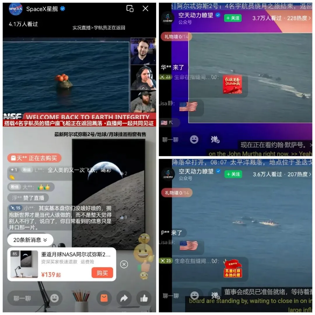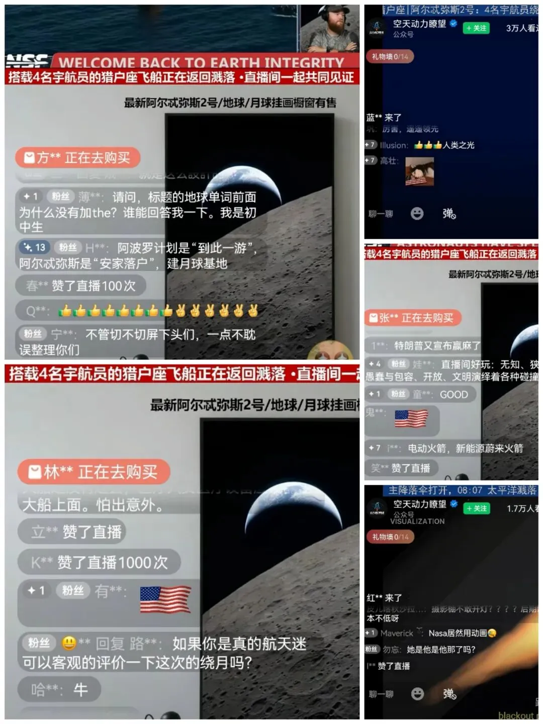 听说B站搬运的NASA直播评论区全是吵架的,微信视频公众号稍微好点,有不少客观的评论。观看微信蝴蝶🦋号直播时会发现评论区主要是爱国批美红粉和崇洋媚外美粉两大基本盘在斗嘴,而且能学到不少网络新名词:羊胎盘,基本盘,养殖户,光盘,盘盘们,抄袭永乐大典……“直播间里真是好玩又好看,无知、狭隘、愚蠢与包容、开放、文明演绎着各种碰撞。”直播间甚至能碰到好学的初中生在问英语单词语法问题。评论区有粉丝问猎户座载人飞船这四人绕月掠月的意义,有个航天粉丝回答得就很到位:阿波罗计划是“到此一游”,太空争霸力压前苏联;阿尔特弥斯是“安家落户”,建月球基地。