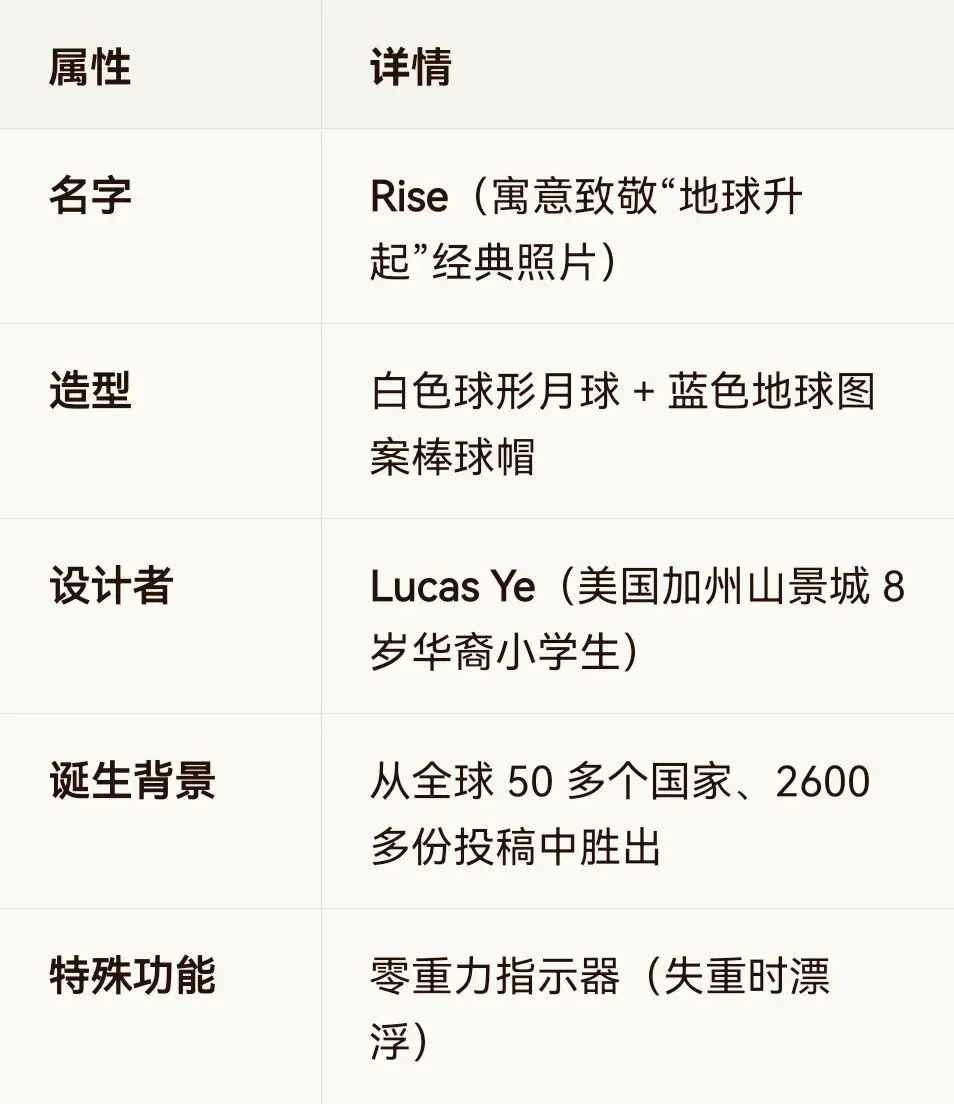 这充分说明咱们国家的公众科普教育任重而道远呀。相比之下美国的公民科学素质培养做得可圈可点。例如,阿尔忒弥斯二号(Artemis II)社会有奖征集设计的官方吉祥物mascot是一个名为 Rise(意为“升起”)的毛绒玩具。它不仅是团队的精神象征,更在任务中扮演着重要的零重力指示器角色(Zero Gravity Indicator)。
