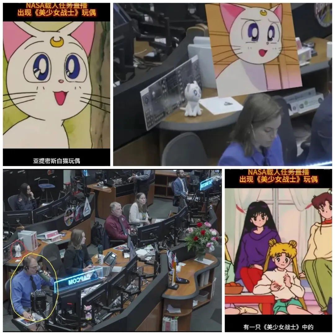 有眼尖的网友甚至在NASA的直播镜头里发现一个下图红圈里的二次元日本动漫《美少女战士》亚提密斯白猫毛绒玩偶。