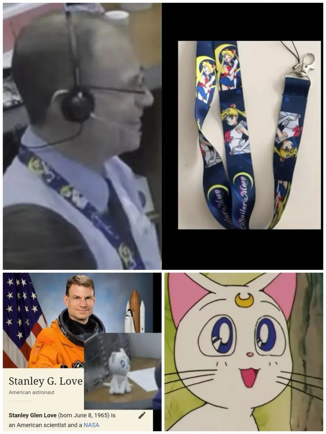 神通广大的网友甚至把亚提密斯白猫毛绒玩偶的主人Stanly G. Love(斯坦利.G.洛夫)给人肉出来了,就是上图黄圈里那个正拿起水杯喝水的神登大爷。年已60岁的斯坦利.G.洛夫是阿尔忒弥斯2号任务的首席CAPCOM(负责与飞船通信的负责人),他年轻时也是一名帅哥宇航员😎;众所周知,他也是一位动漫迷,因为人们经常看到他佩戴着美少女战士的挂件,看着真是很有反差萌感呀😘这也算是NASA本次直播中一个很有趣味的花絮吧😍
