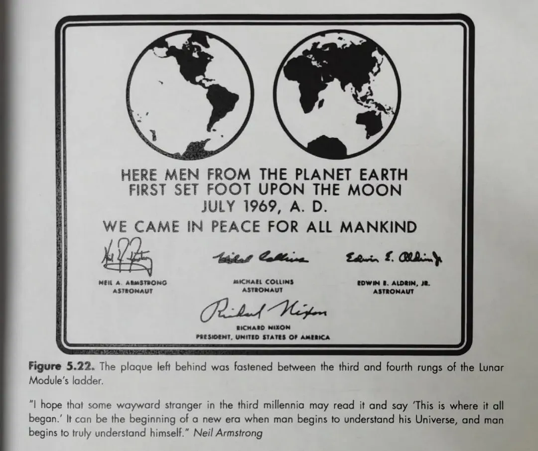 有趣的是,澳大利亚作家Hamish Lindsay在其2001年由伦敦Springer-Verlag London Ltd出版的《Tracking Apollo to the Moon》大作中这样评论道:“On one of the Lunar Module's legs is a plaque signed by President Nixon and three adtronauts to commemorate the landing. It is ironical that President Nixon's name goes on the plaque on the moon, when it was Kennedy and Johnson who did so much to bring the event about.”