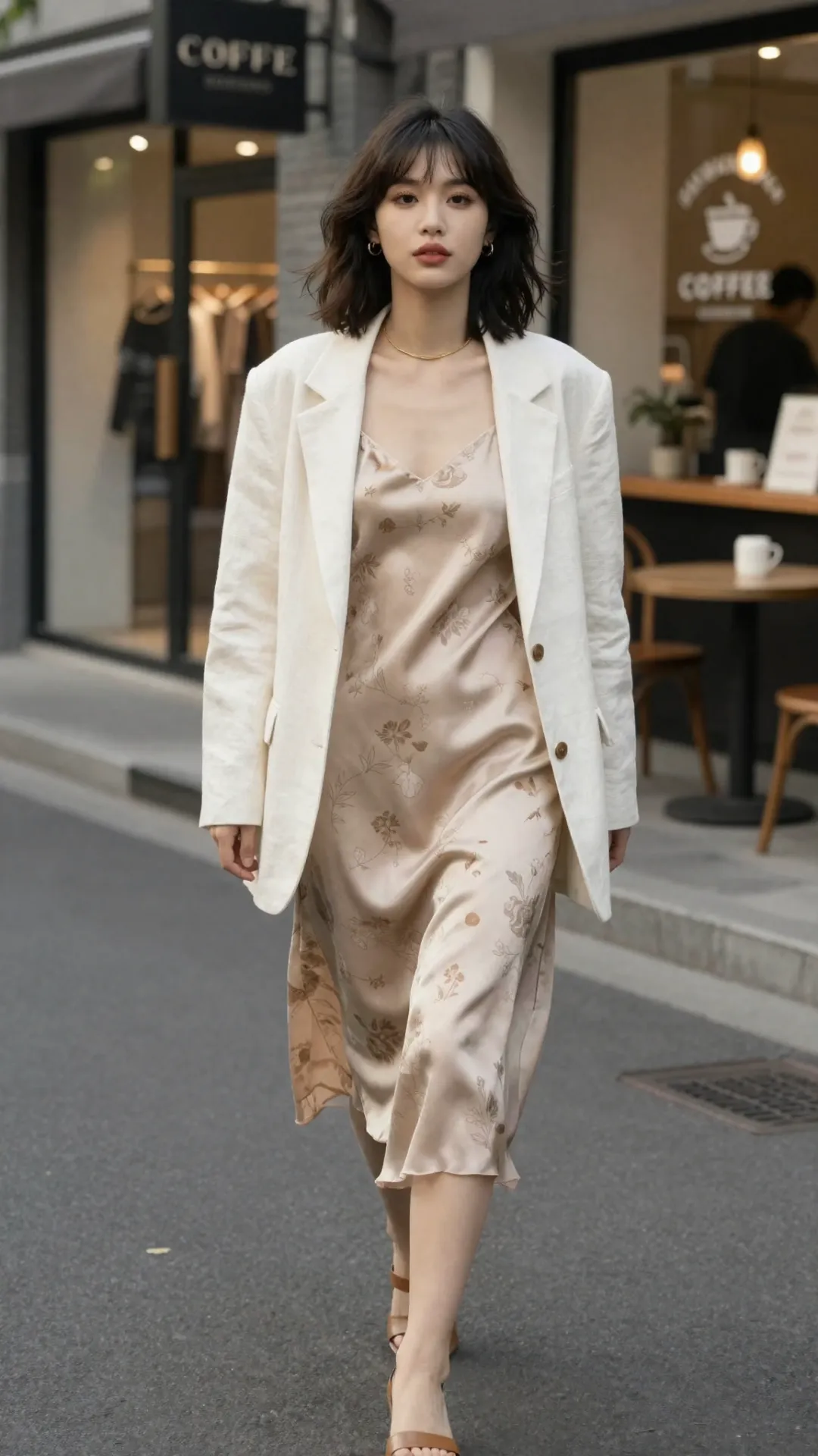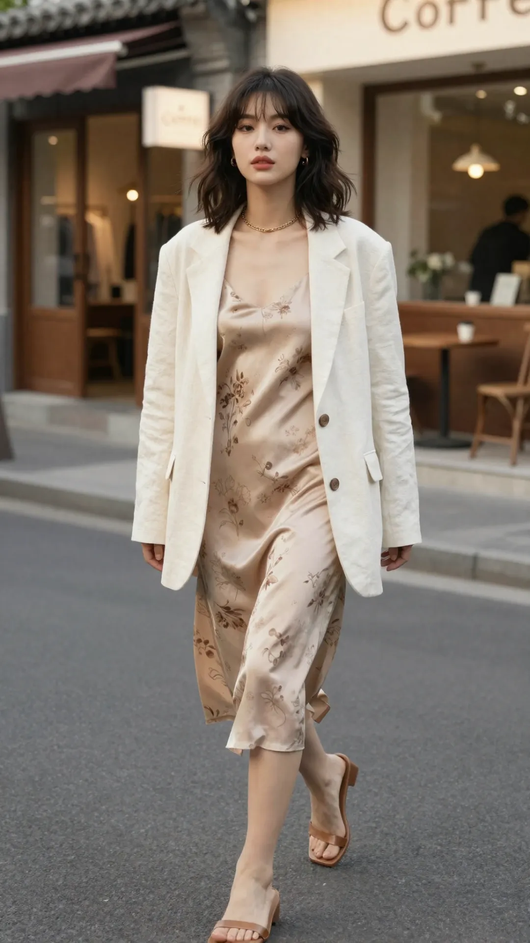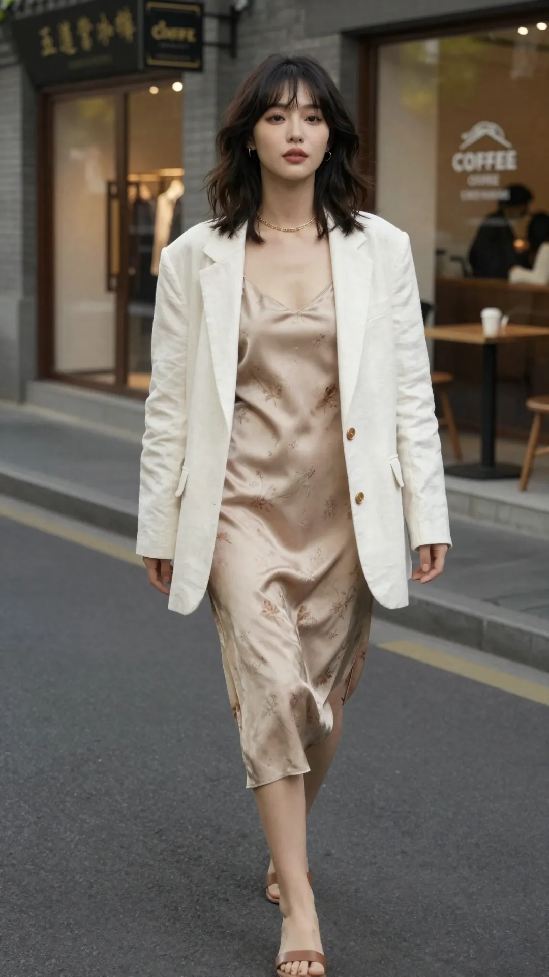 四月的风,带着咖啡香,掠过街角的砖墙。她自光影里走来,米白的西装外套,如一朵初绽的云,轻轻拢着内里那件碎花裙。裙裾是浅杏色的绸缎,缀着细碎的花影,像把整个春天的温柔,都缝进了经纬。
