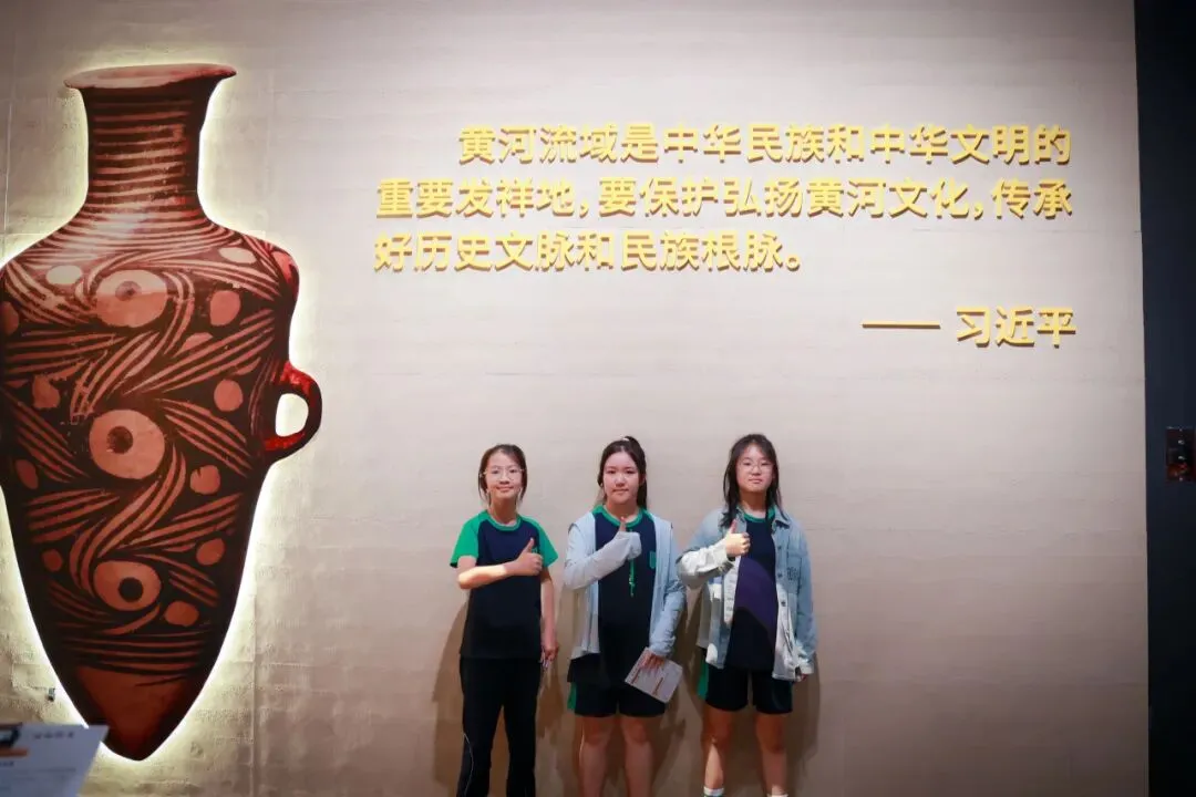 在转角处,孩子们望见了习近平总书记提的一段话:黄河流域是中华民族和中华文明的重要发祥地,要保护弘扬黄河文化,传承好历史文脉和民族根脉。