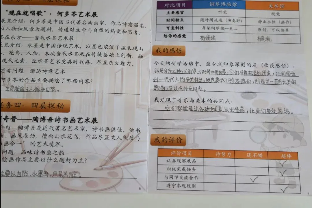 一场五官的享受,在听觉与视觉间来回切换,研学手册的最后一页,有一个双馆对比表,让孩子们思考钢琴博物馆和美术馆的异同,请孩子们描述不同的感觉,有孩子说:钢琴表达的有情绪,美术表达的有意境。他们都是情感表达的一种形式,都很有艺术价值,让我们提高了审美。