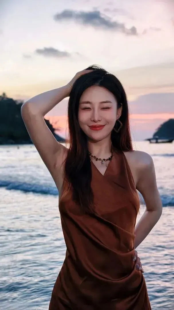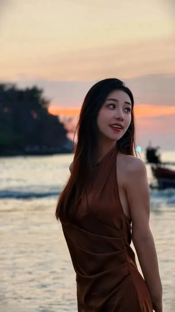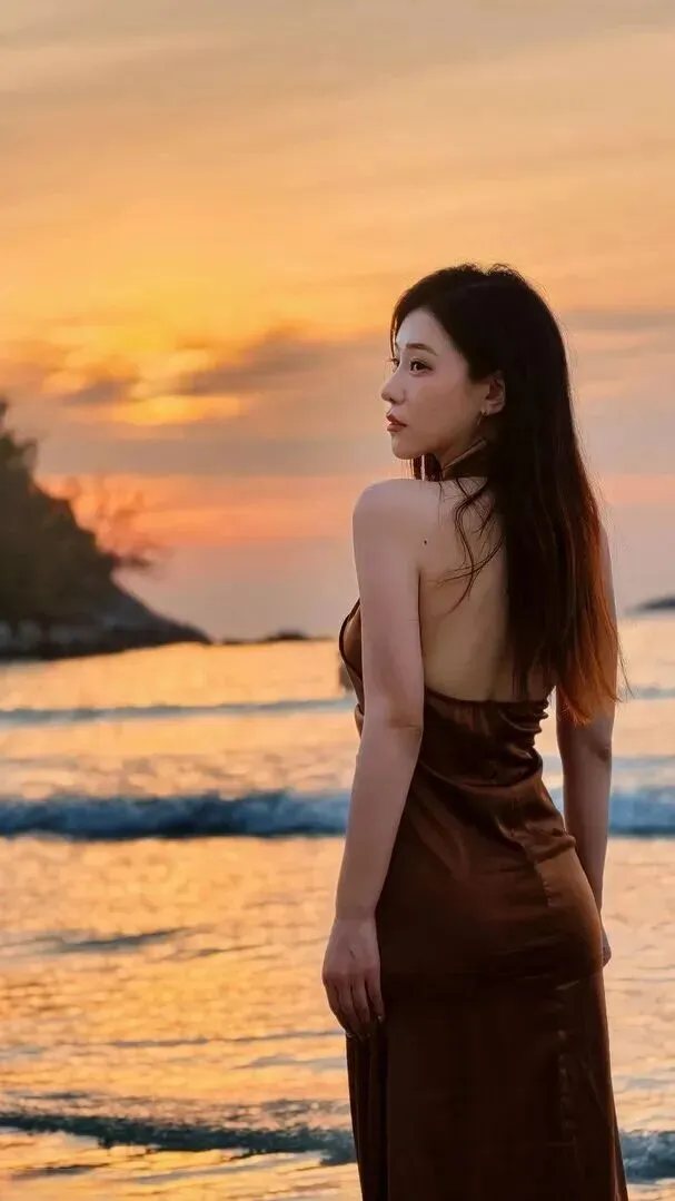 傍晚海边的夕阳把天空染成暖黄色。海浪轻轻地拍打沙滩上,一阵风来也带来海水的香气。这时候穿对衣服真的太重要了。穿着深棕色、系着脖子的丝绸长裙站在沙滩上。裙子的颜色同夕阳一起消失,全身发出光辉。