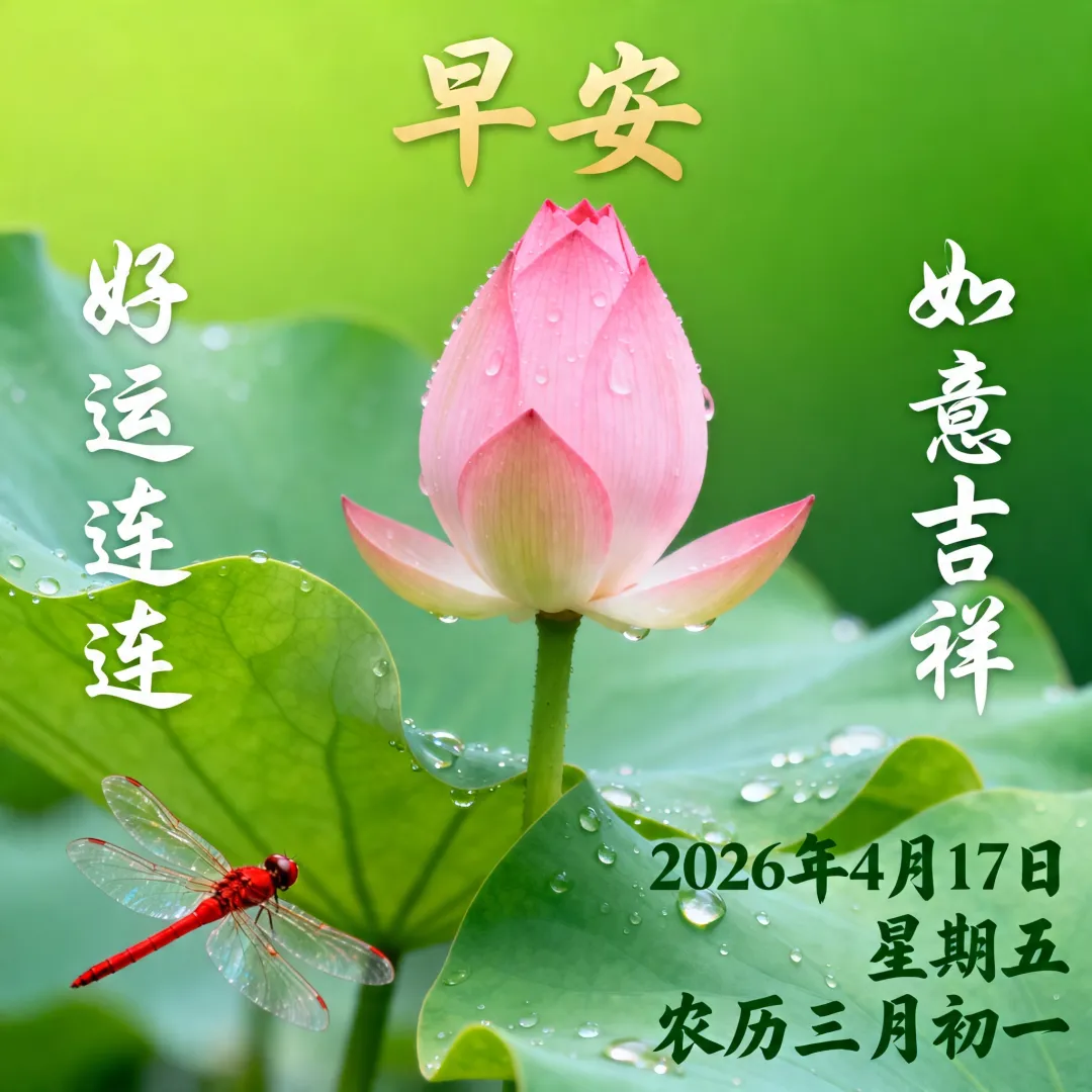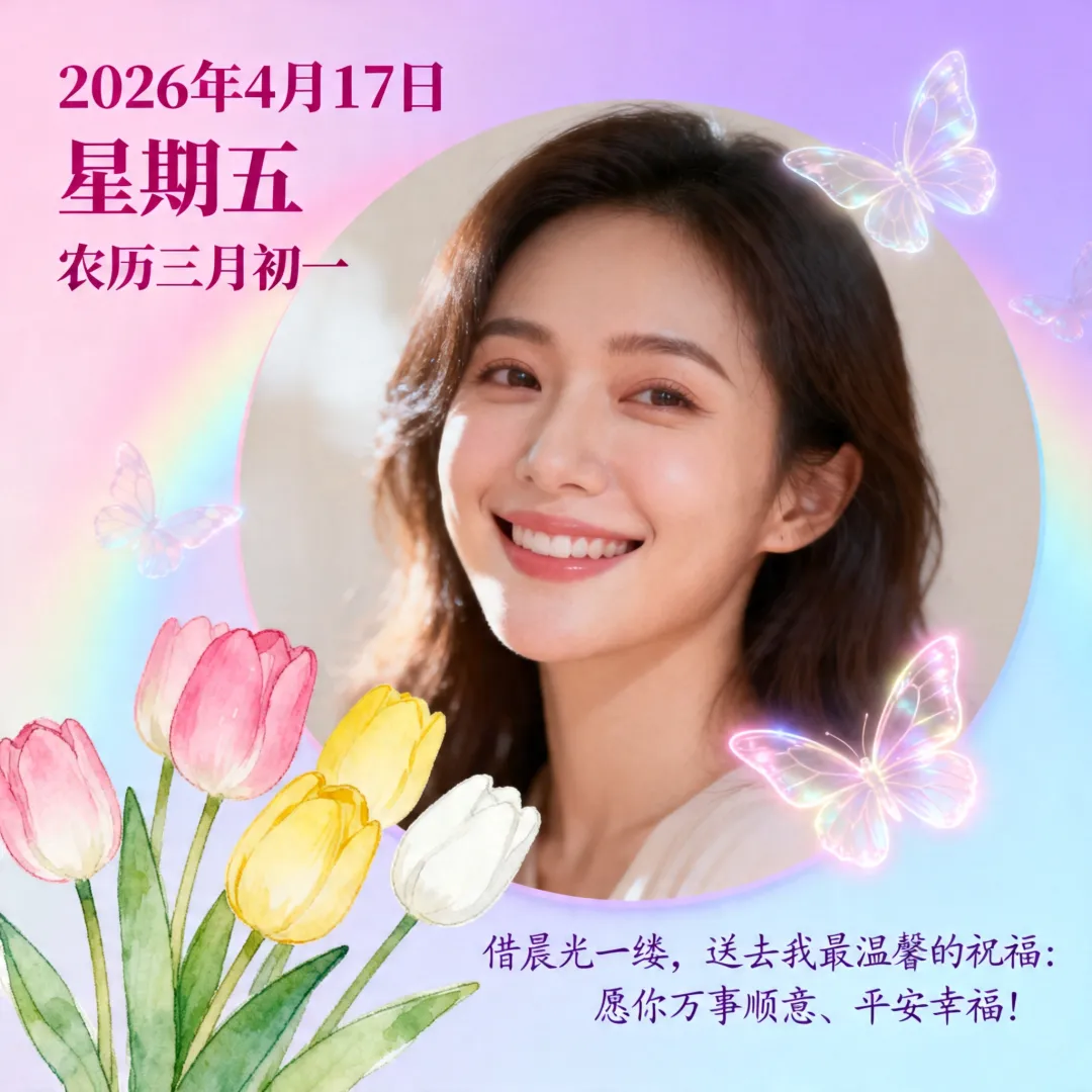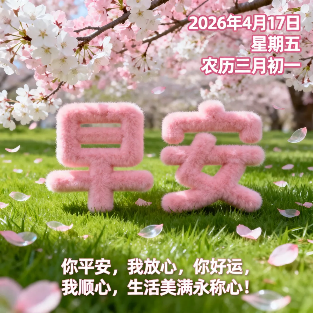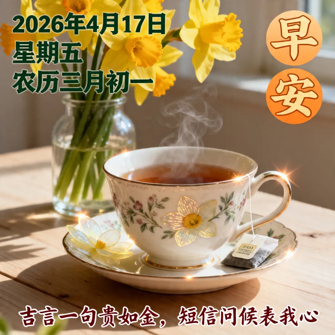 当前位置:首页>美女资讯>2026年4月17日正方形问候图片带日期:晨起送祝福,愿你日日安康,万事顺心.