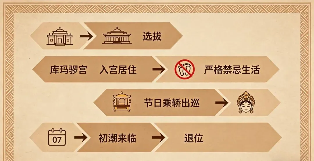 • 起源于17世纪马拉王朝,传说女神因怒离开王宫,托梦要求王室遴选女童供奉