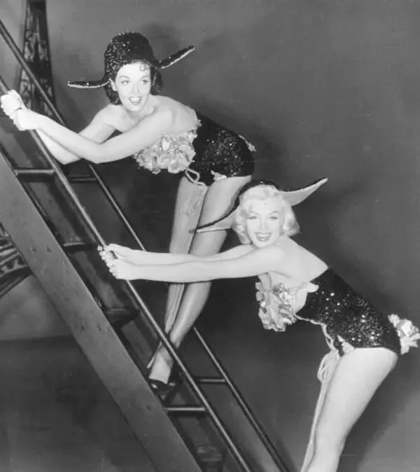 梦露和搭档一起扮演表演中的模样,这衣服一看就不是谁都能穿上身的,贴身亮片,侧面有大朵花朵点缀,肩头带着夸张帽檐儿,姿势调皮,两个女星笑得牙齿都露了,爬在阶梯上冲观众眨眼,小时候看黑白片,心里就想着哪天大了也许敢这么亮相,妈妈摇头说,敢真穿成那样上街能把整条胡同看傻了,她那辈子只在戏台看过这种劲头。
