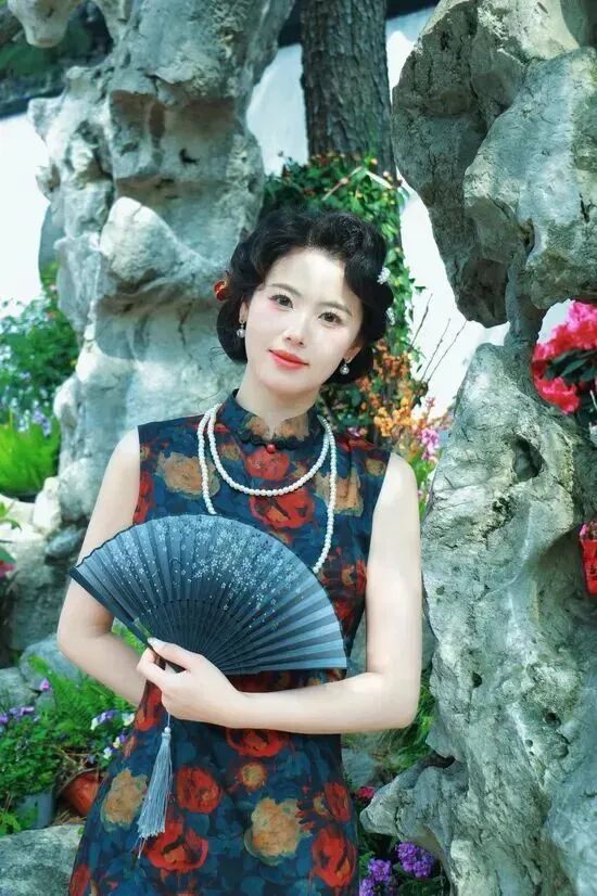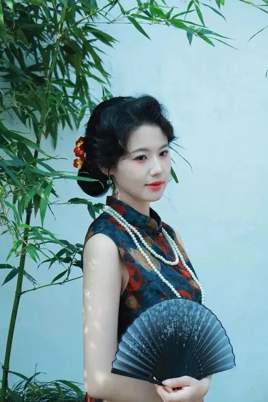 复古的盘发、波浪卷发处理得很好。民国时期的自然波纹是自由而又有雅韵的。发间插着红色花朵的发饰,给深色系的服装增添了不少活泼的颜色,完美的再现了旗袍上的花纹。