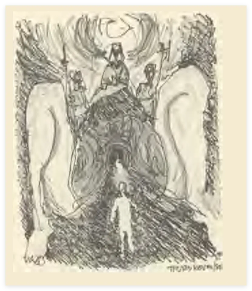 女神作为区别于大母神的存在重新出现,这一点在男性的梦中也同样明显。一位男性做了这样一个梦:他正走向一座看起来像山的东西,结果发现那是大母神的阴阜。他站在她巨大的双腿之间,然后走向她的阴道,意识到自己应该走进去。阴阜的顶端站着三个女巫,活脱脱是《麦克白》里的样子。出于对被吞噬的恐惧——一种根深蒂固的男性恐惧——他在大母神的脚上系了一根羽毛,又在羽毛上拴了一根绳子,另一端握在自己手里。他的想法是,如果自己被困在里面,就拉绳子,这样会挠到大母神的脚,他就能逃出来。然而,一旦进入大母神体内,他看到了一个散发着光环的物体,那物体转向他,显露出埋藏在母亲子宫之中的女神。