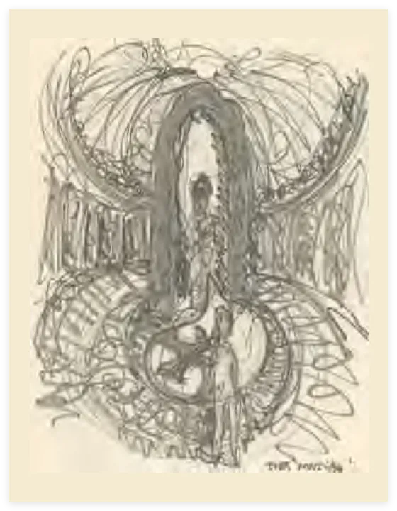 听到这个梦,人们立刻会想到美杜莎——那个戈耳工女妖,她丑陋到任何人看她一眼都会变成石头。但随着梦的展开,我们清楚地看到,这种能量并非吞噬性母亲的能量。无意识巧妙地将其呈现为一位仁慈的女神形象。梦者后来画下了那条蛇形成的“光环”。她的素描让人想起开悟的佛陀,头顶环绕着七条蛇(代表七个脉轮)的光环,象征着开悟的意识。