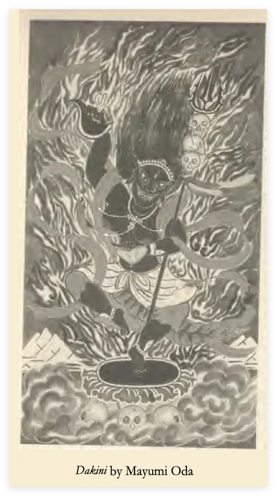 这种从大母神子宫中涌现的空行母能量,在很多方面与卡莉女神相似。伴随空行母的三件主要法器是钩刀(或剑)、盛血的颅器和三叉杖。根据阿利奥内的说法,藏传佛教意象中的钩是慈悲之钩,“是将众生从轮回中拉出的钩……它将人从苦难中拽出,斩断以自我为中心的我执,并以金刚般的清明为指引。”颅器则被比作坩埚,是盛放原始激情之血的容器。“红色的血液象征着女性燃烧的内在力量,是能够孕育婴儿、化作乳汁、迸发激情与勇猛的原始母体,是生命的原始熔岩。”