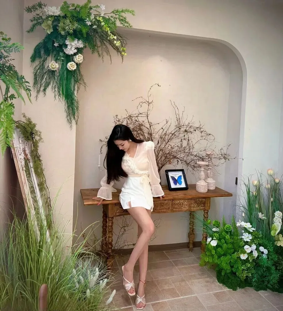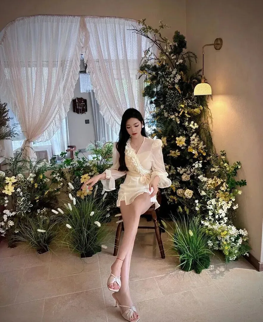 照片中坐着她的是一个红色木纹椅子上开着白色的花瓣,这是作者最喜爱的一种颜色。那条法式复古连体短裙米白色的基调,V领的交叉设计以及两侧荷叶边,腰间的同色系束腰将整个细节美展现出来。脚腕周围所点缀的红色线条给整个画面增加了几分活泼。
