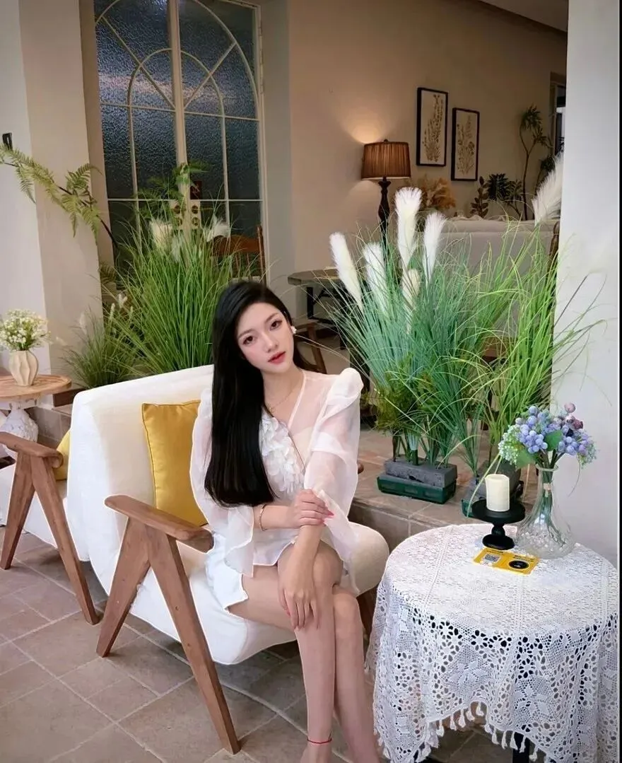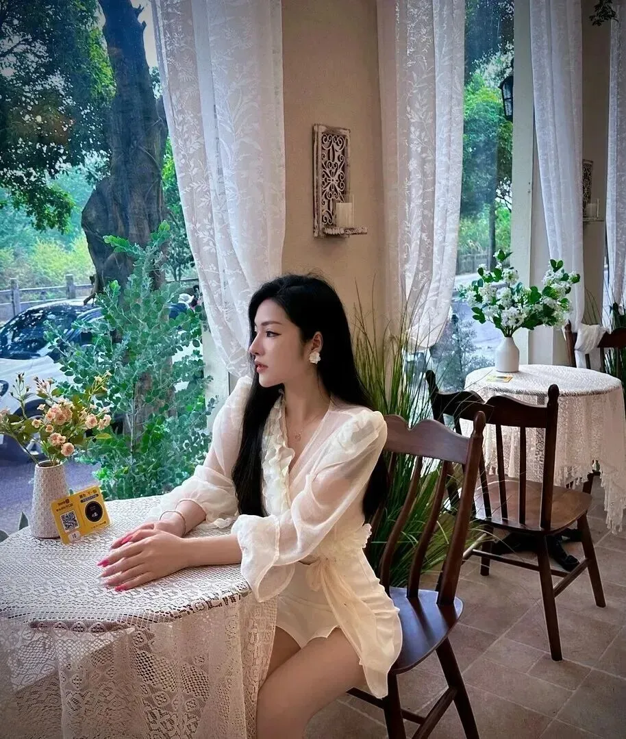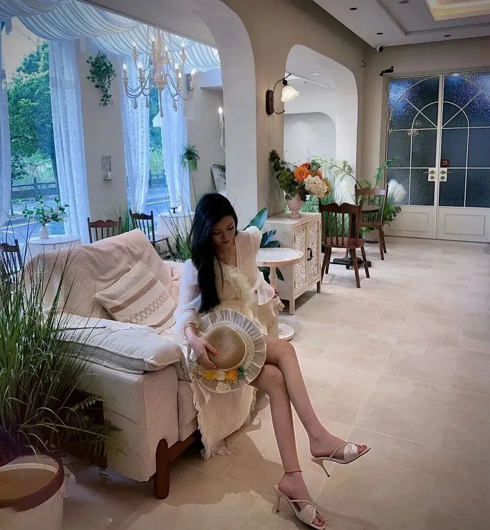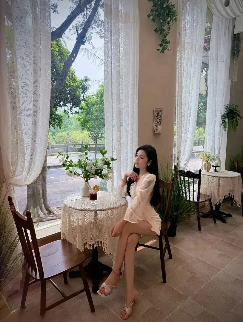 转到户外的休闲餐区,她依然端庄优雅地坐着,耳朵戴着白色的花朵耳饰,脖子上戴着简约的金色锁骨链,饰品选择低调干净,用最少的元素达到最好的效果。用玫红色指甲油来点缀出米白肤色的光彩。