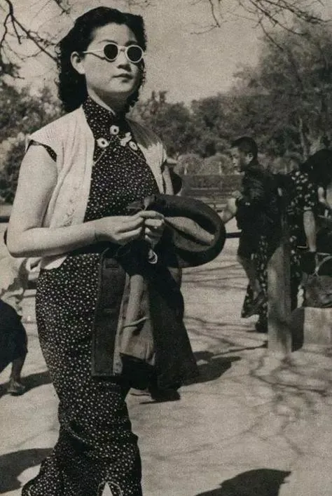 图中这位戴着圆墨镜的旗袍女子,身姿端正,劲头十足,左臂抱着衣裳,右手轻轻握着手包,黑底白点的旗袍裹着身段,腰线收得恰到好处,那墨镜一戴,气场就不比谁差,看久了才发现,这打扮倒有点像现在姑娘的意思,可人家那年头可不是赶时髦,是过日子的本色,走在路上神情自若,像有点赶路的急劲儿,脚步干脆,这种自在,在今天满大街的滤镜下还真难装出来。