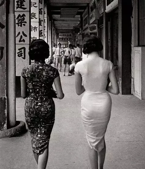 两名旗袍女子并肩行走在老街长廊下,一深一浅的裙身贴着腰线,胯部的曲线被布料顺着拉下来,后背微直,从远远的过道看过去,身影拉得很长,行人见了都要多瞧两眼,外头写着大大的招牌,巷口有小贩吆喝,听说以前女孩子结伴上街,旗袍是要定做的,量好身形,师傅一针一线全按“合体”来,妈常打趣说,现在都成了拍婚纱照的背景,谁还舍得天天这样逛街,可让人念念的,偏是那个“路人回头”的老味道。