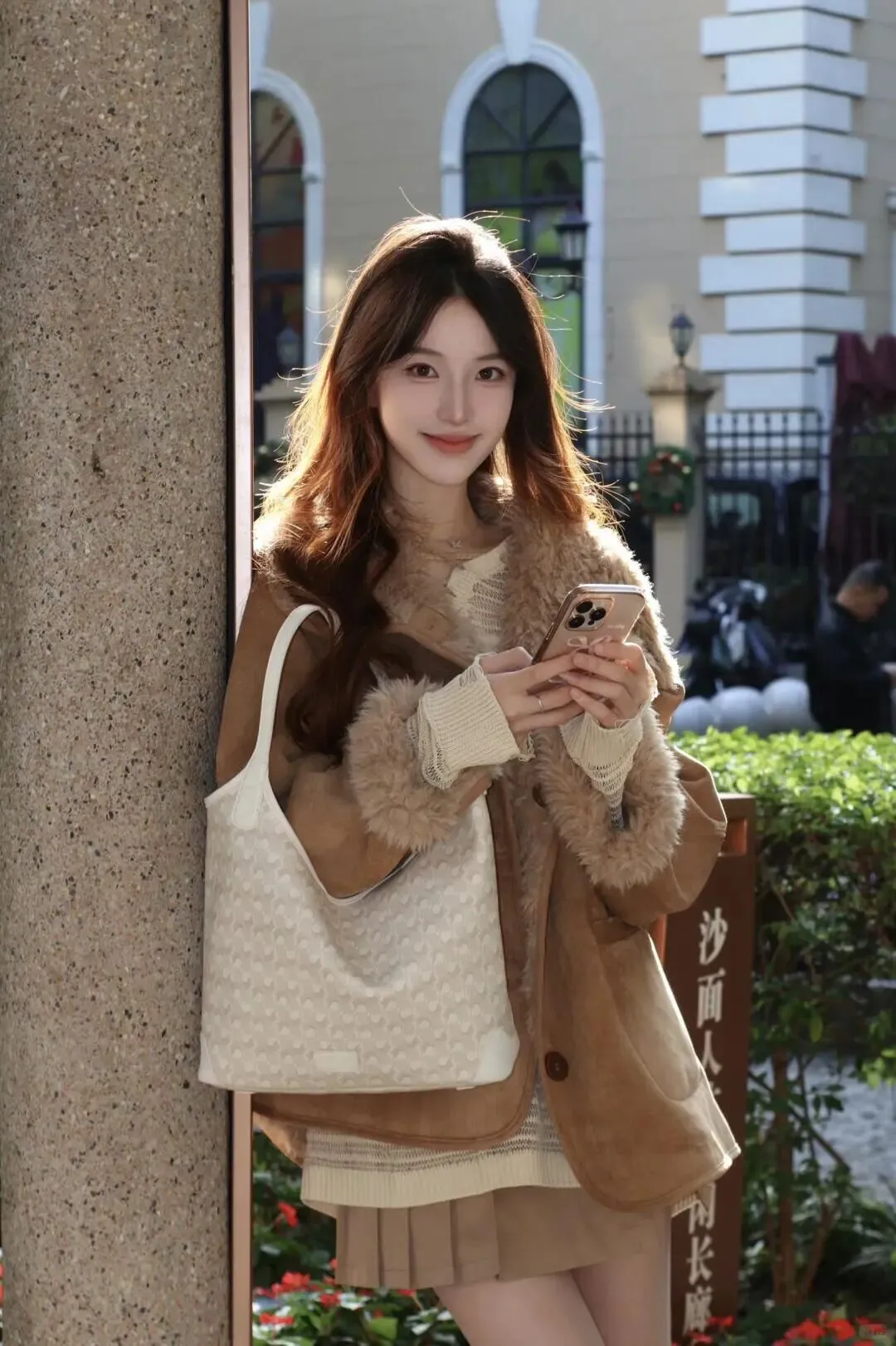 出门拍照手不知道往哪放是通病,这时候手里的手机、包包就是最好的道具。不要死死地攥着手机,轻轻捏着边角,或者假装在看消息,眼神自然下垂,这样能营造出一种被抓拍的生活感。白色的帆布包不仅百搭,还能作为前景遮挡,增加画面的层次。当你倚靠在建筑物旁时,一只手插兜,另一只手拿着手机自然垂落,或者把包包随意地挎在臂弯,身体重心放松,瞬间就能摆脱游客照的呆板。道具的存在是为了让你有事可做,而不是为了展示道具本身,自然互动最重要。