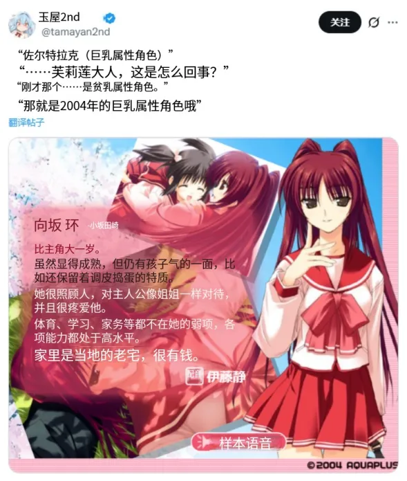 前段时间,一位日本画师发帖调侃如今人们对“大”的认知。帖子提到的向坂环(环姐),出自2004年游戏《ToHeart2》,三围89/58/82,至少是个D。在那个年代,环姐是性感丰满的“大杯”。但20多年后的今天,有人笑出声:“哈哈,就这?小杯罢了。”