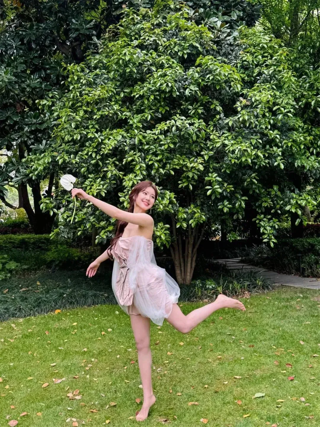 照片里的赵露思,完全抛开了明星架子。她单腿抬起时,修长笔直的腿部线条一览无余;脚趾自然舒展的模样,仿佛能让人闻到青草的香气。那身浅粉色抹胸裙恰到好处地勾勒出纤细腰肢,整个人轻盈得像是随时会随风起舞。