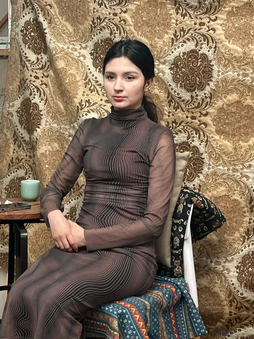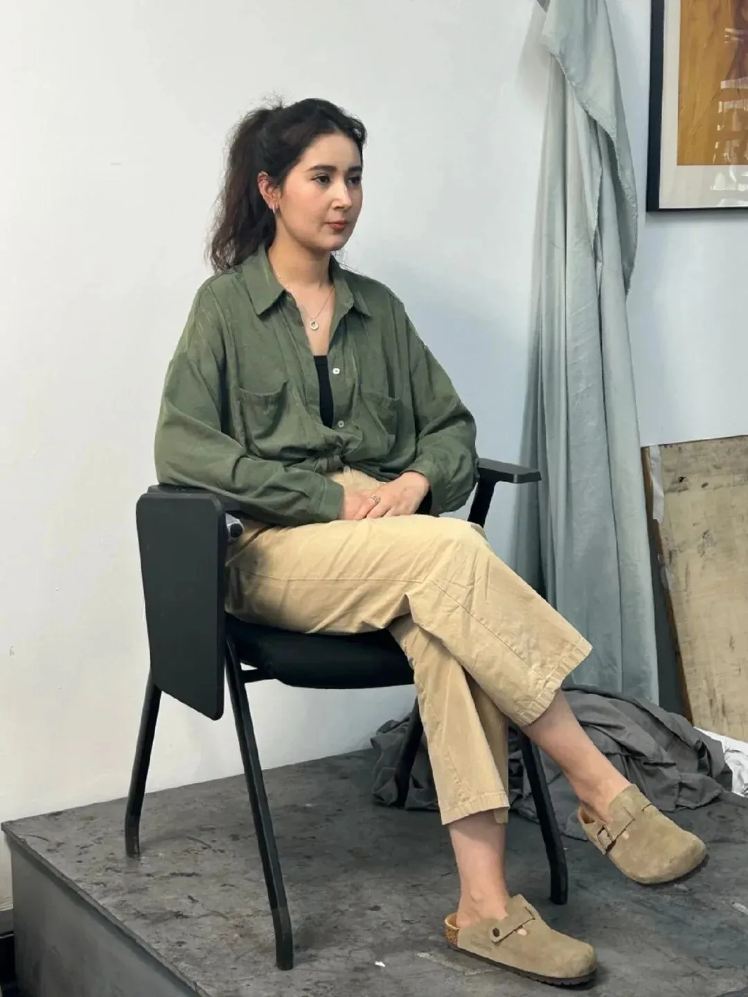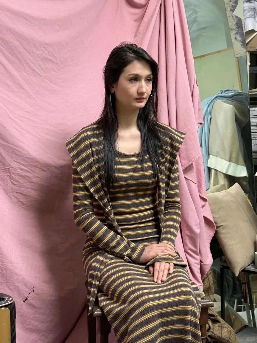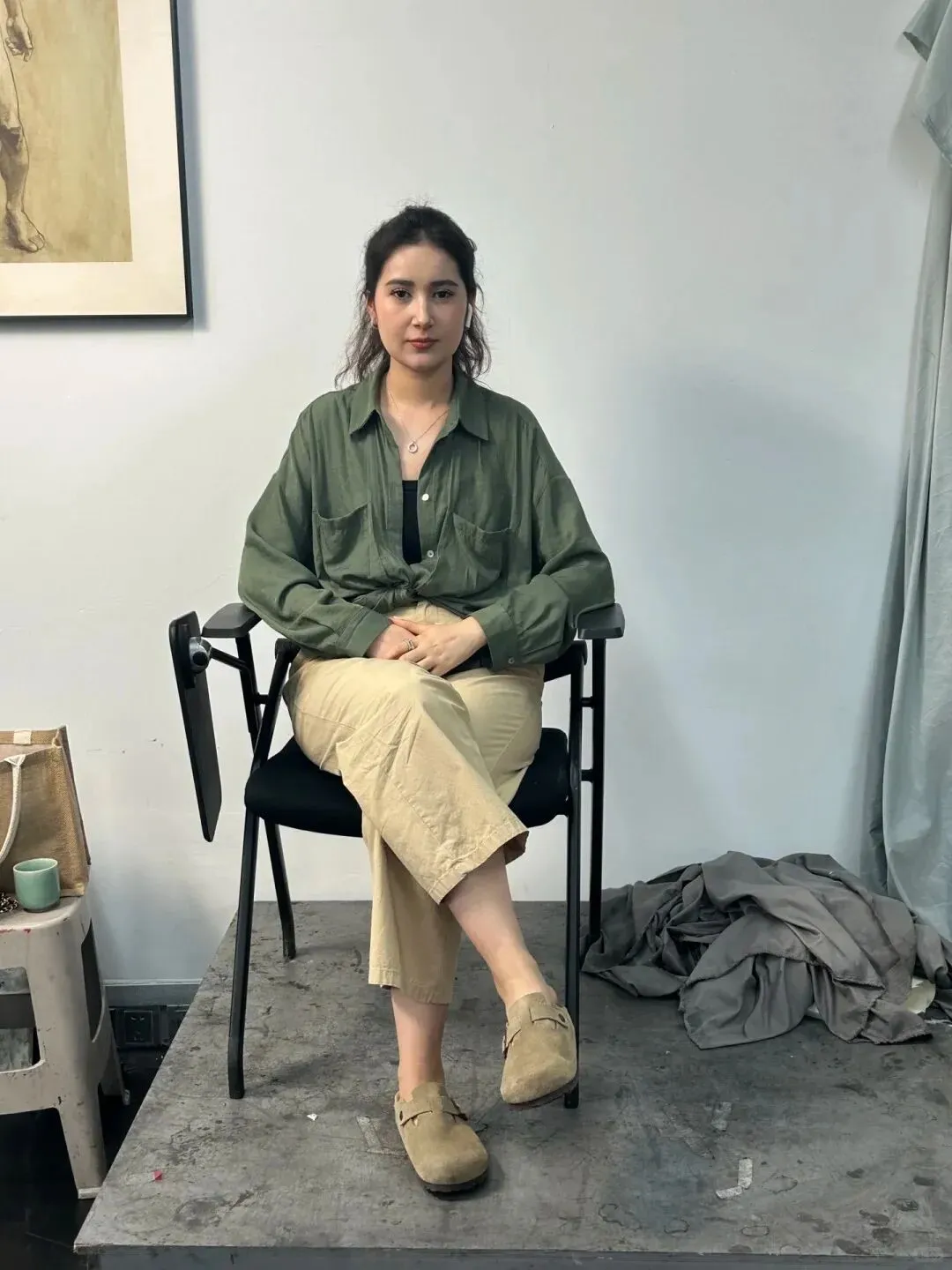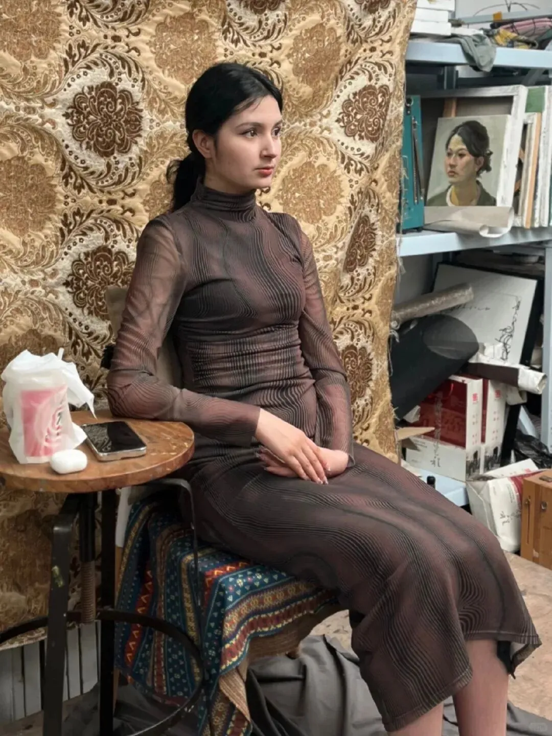 而众多作品中,最后一张实在美得让人挪不开眼:模特身着传统艾德莱斯绸长裙,裙摆的色彩在素描纸上化作深浅不一的灰色调,却依旧能让人感受到丝绸的光泽。