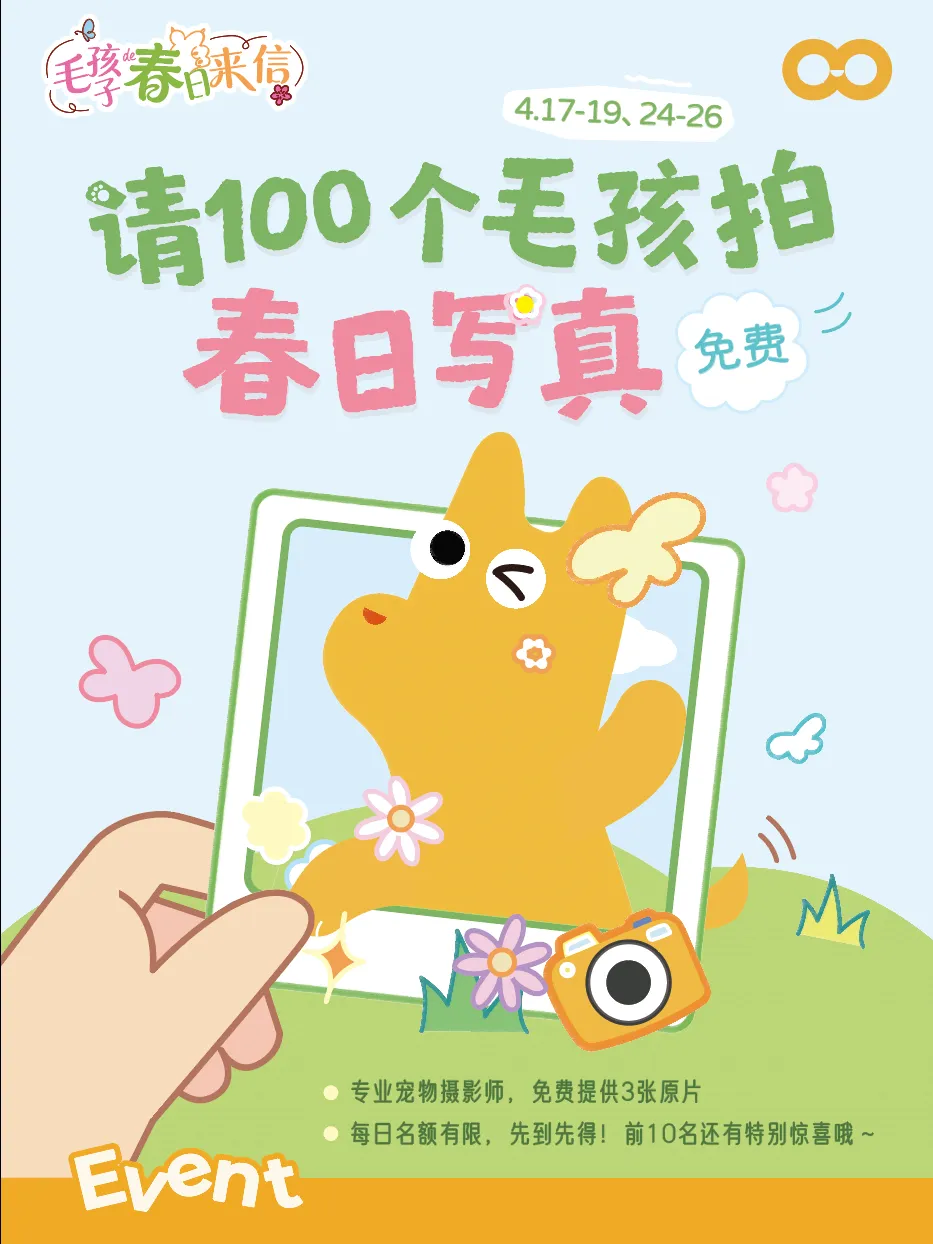 用镜头定格毛孩子的灵动瞬间,把春日的软萌美好永久珍藏!“100只毛孩免费春日写真拍摄活动,无需花费,就能给家里的萌宠拍一套氛围感满满的春日写真照,让毛孩子化身小小模特,在春光里留下专属的可爱影像。