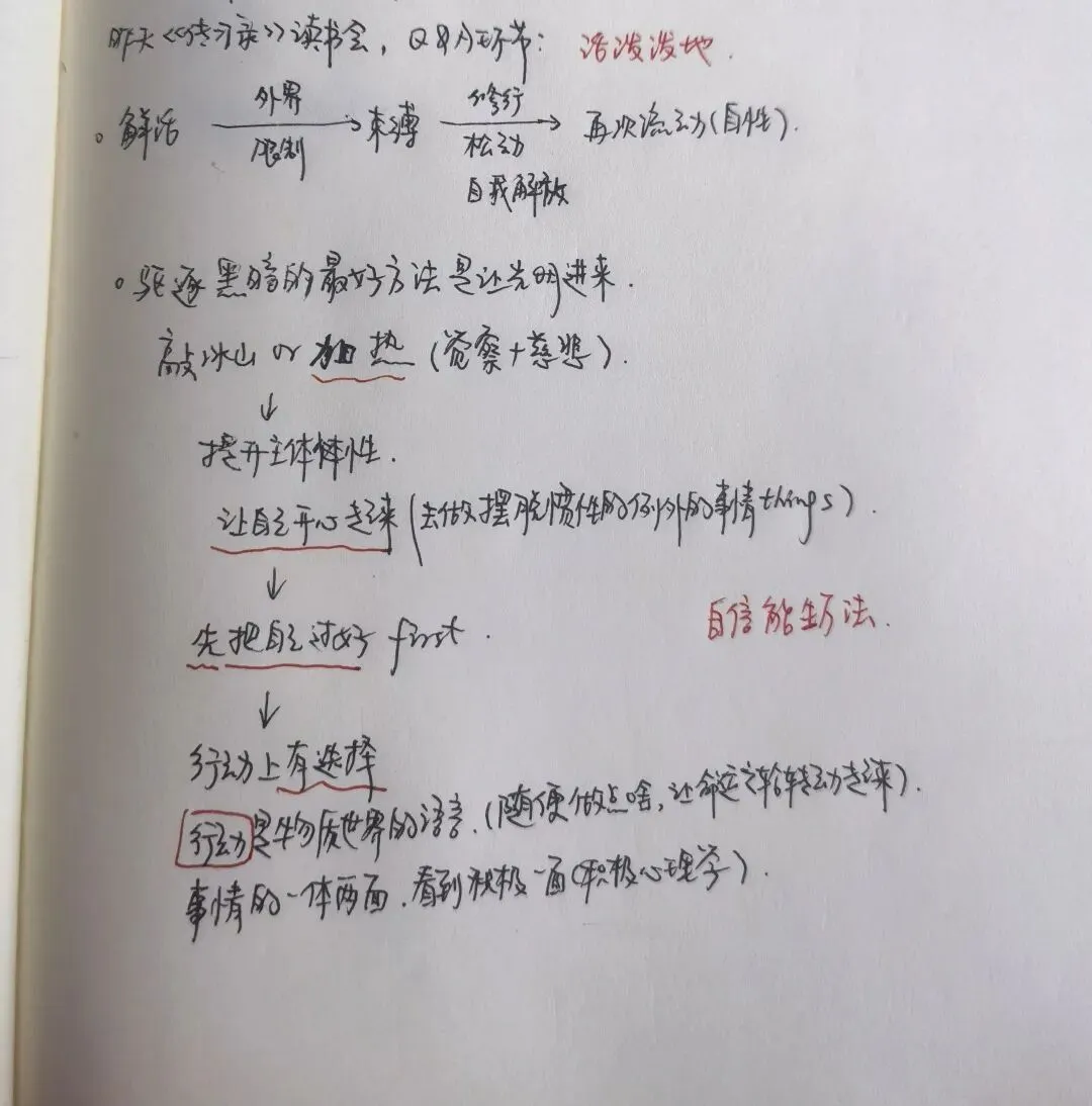 我们生命生来是鲜活的,成长过程中受到外界社会的限制,逐渐被束缚住,但是通过自我解放、修行,可以再次松动开,发现自性,再次流动起来。他提到驱逐黑暗的最好方法就是让光明进来。看到我们曾经受到创伤被冻住的部分,不是用力去敲,而是给予觉察和慈悲,进行加热,提升自己的主体性,让自己开心起来。先把自己过好,行动起来,知道我们总是有选择的。事情的发生是一体两面,我们可以主动选择看到积极的一面,信任生命的发生。跟随自己内在的小兴奋,去滋养自己。慢慢地,我们会发现黑暗也被容纳进来了。