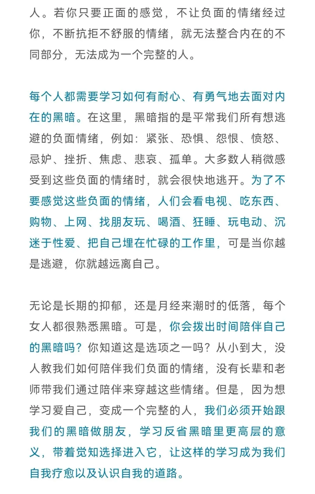 在黑暗中,我陪着自己,始终不抛弃自己。当情绪波涛汹涌地来了,我始终有耐心、有信心陪着自己度过。我知道,无论怎样的情绪,都是会消散的,而我要做的,就是陪着自己,经验它——感受它,表达它,穿过它,回来。