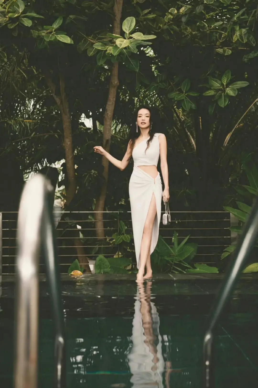 先说说那身斜肩露腰白裙的致命之处。这不是市面上泛滥的清纯小白花款式,而是像希腊雕塑家手中的大理石、像未完工的极简主义建筑般的存在——斜肩剪裁精准地卡在最微妙的锁骨凹陷处,一侧肩头完全解放,另一侧顺着手臂蜿蜒而下,形成不对称的视觉张力。最绝的是那露腰设计,在收紧的版型中形成惊心动魄的停顿,腰肢的纤细与肌肤的质感在白色面料的衬托下泛着珍珠母贝般的光泽。那种"哪个男人看了不心动"的杀伤力,比直白的暴露高级了不止一个段位,美得让人瞬间理解什么叫"气质这块拿捏得死死的"。