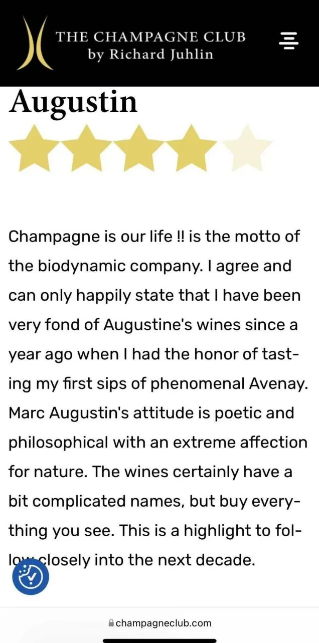 这瓶酒的酿造者Marc Augustin是个不走寻常路的酿酒师。他提出“用心种植”(cœurviticulture),坚持以爱与灵性呵护葡萄藤——在葡萄园四角埋水晶、播放音乐、只请女性采收,以维持土地的“母性频率”。听上去有点玄学,但他的香槟却被品酒专家称为“魔幻而精致”。