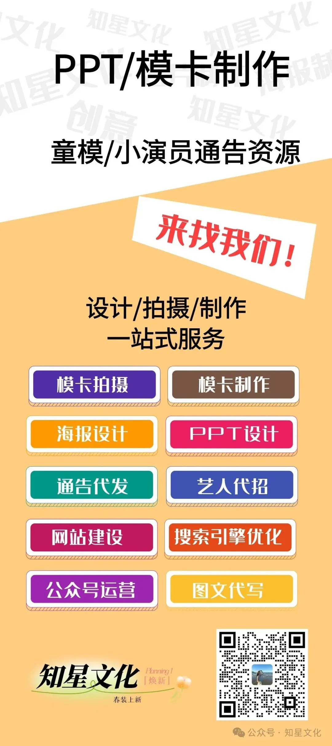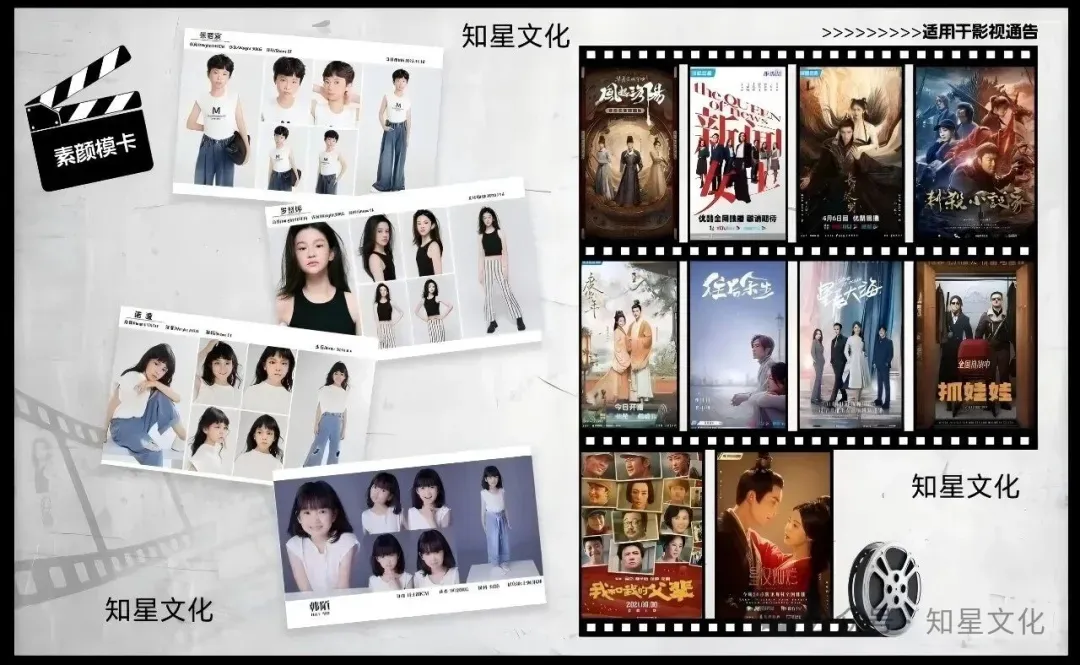 我们长期从事演艺资源对接方面的工作,积累了非常多的商家经纪资源。专业提供小演员,小模特,平面拍摄,服装拍摄,商品拍摄,买家秀,时装周,走秀,影视,短视频,tvc,宣传片,群演,综艺等专业提供靠谱圈内影视拍戏通告信息服务。知星文化专业与影视小演员、小模特、童模通告对接与选角casting模卡拍摄方面的工作,在影视圈内汇集合作和认识的大量的演员和副导演、群头经商家等职业人群的资源。